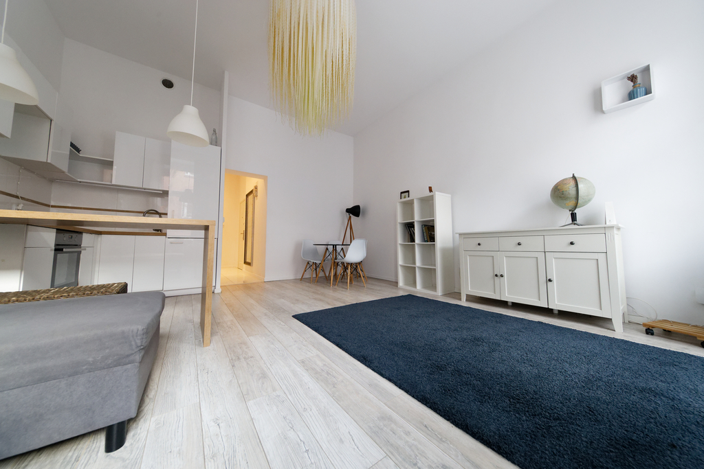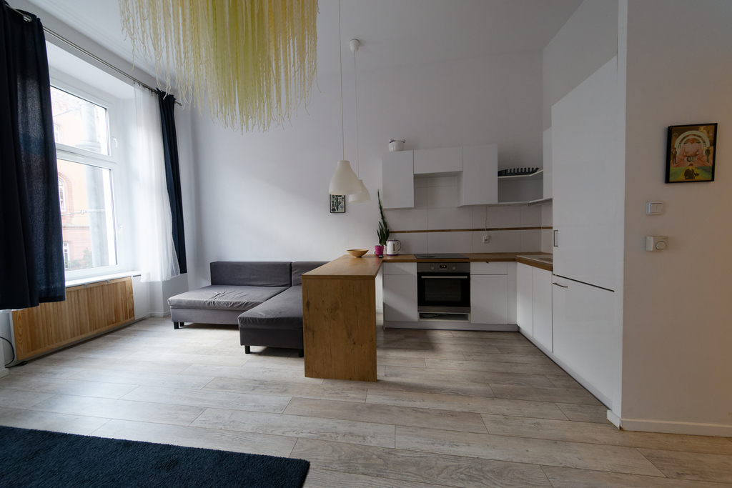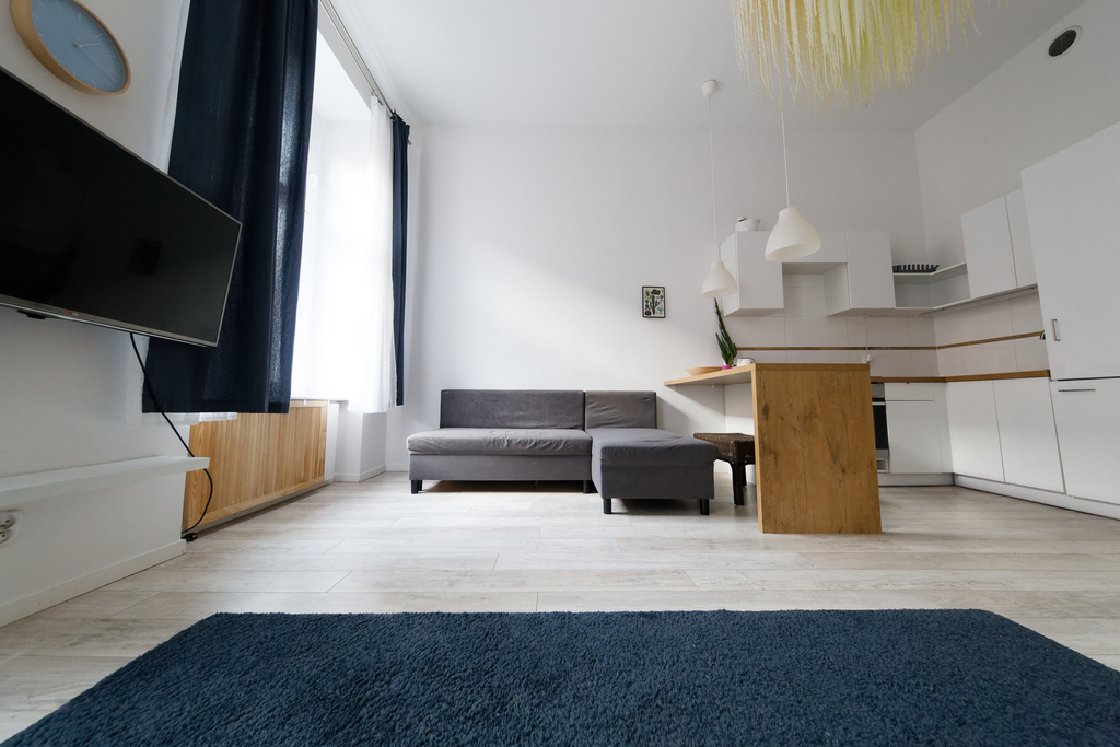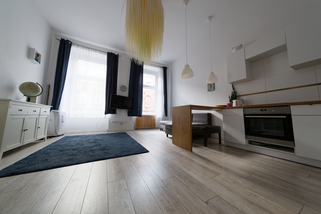 Funkcjonalny rozkład pomieszczeń: przestronny, słoneczny salon z aneksem i częścią jadalną oraz cicha sypialnia od strony podwórza.