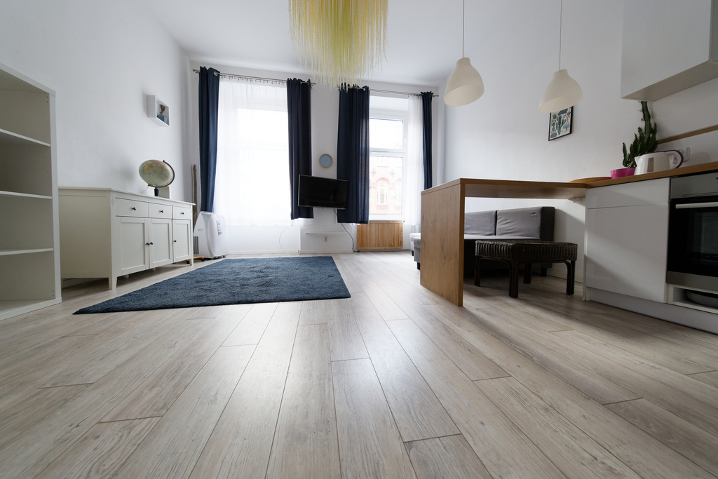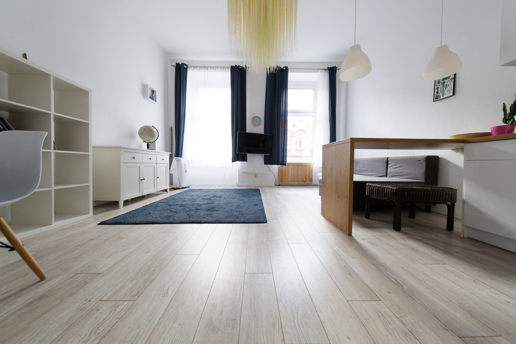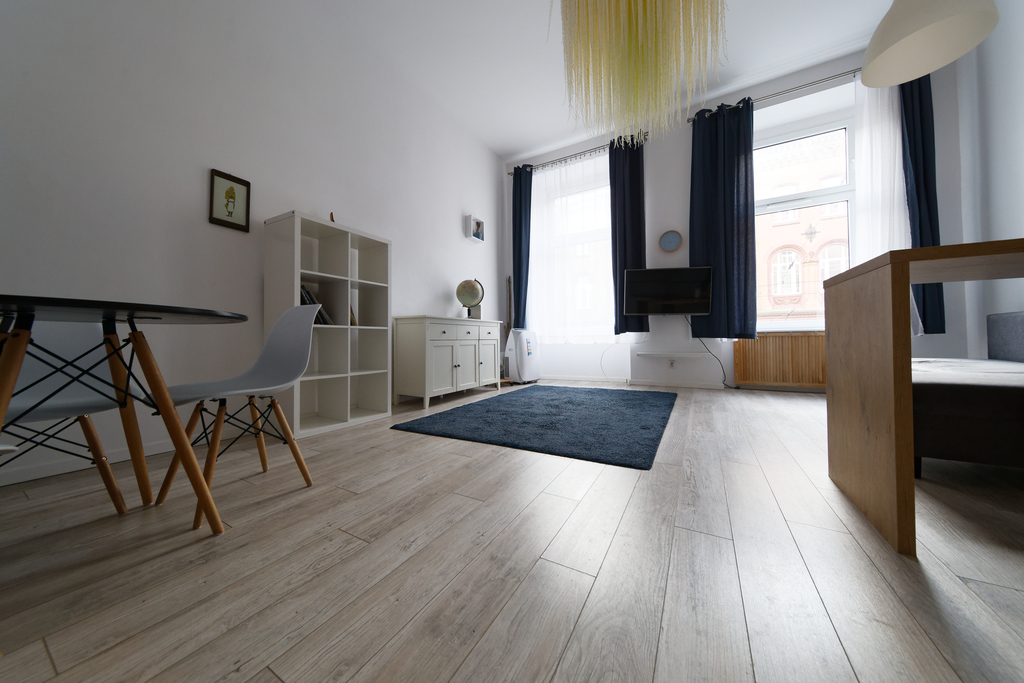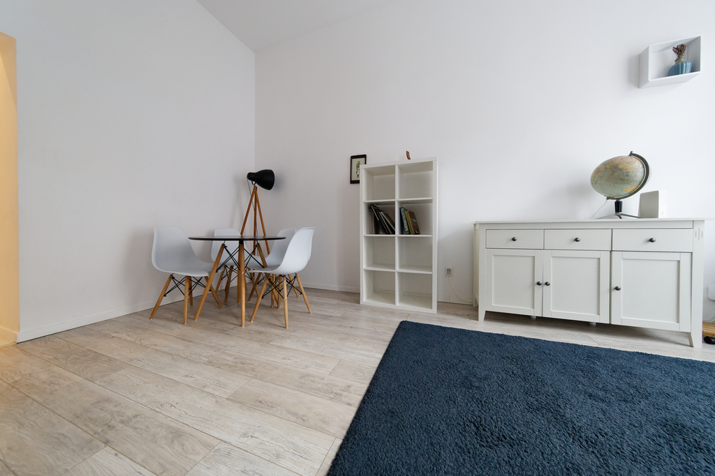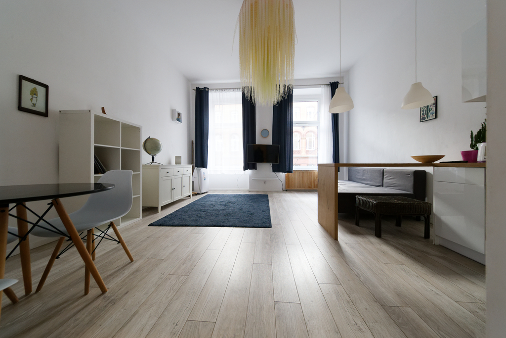 Funkcjonalny rozkład pomieszczeń: przestronny, słoneczny salon z aneksem i częścią jadalną oraz cicha sypialnia od strony podwórza.