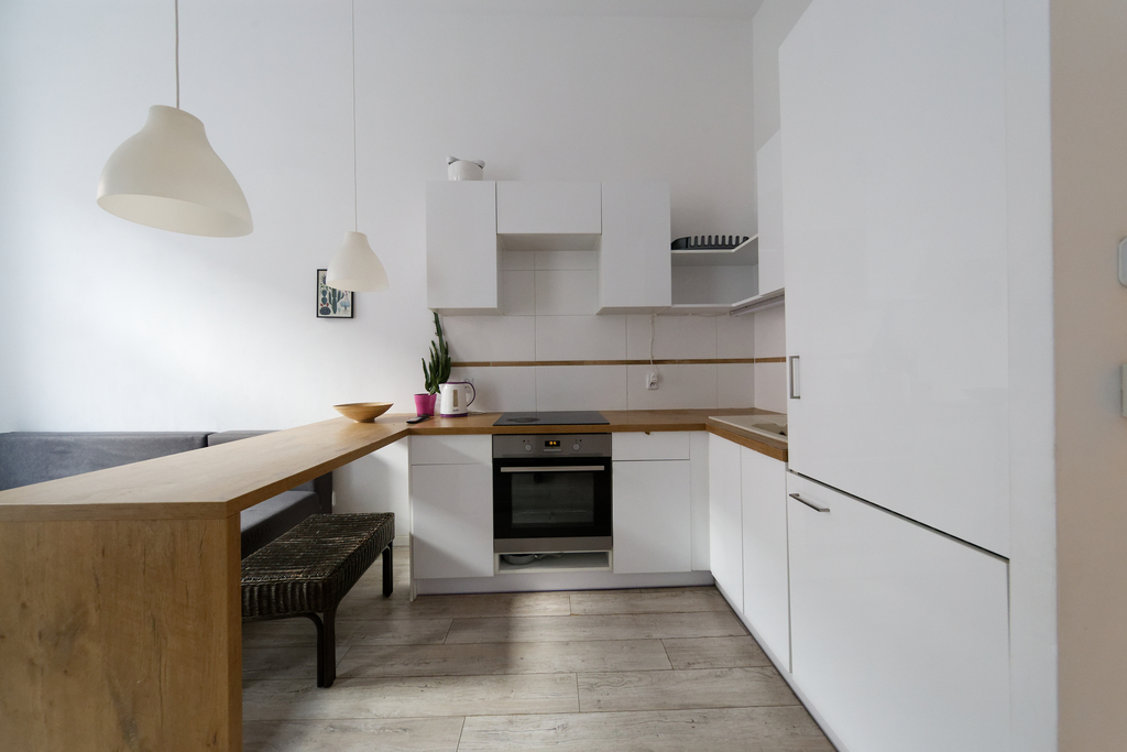 Kuchnia: Płyta indukcyjna, piekarnik, lodówka, pralka.