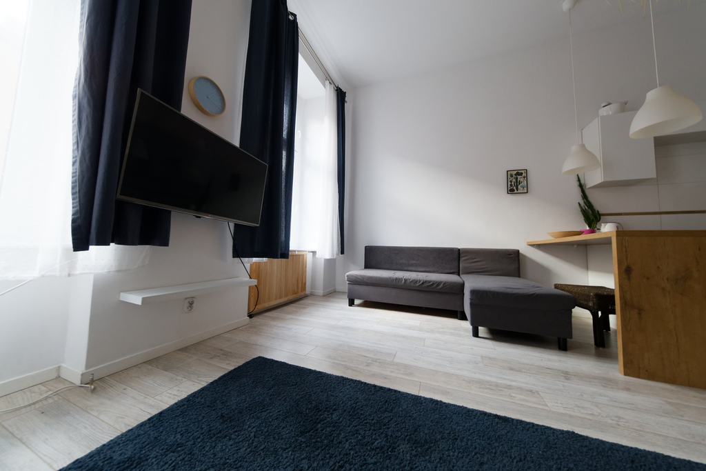 Salon: Rozkładany narożnik dla dwóch osób, smart TV - 42 cale.