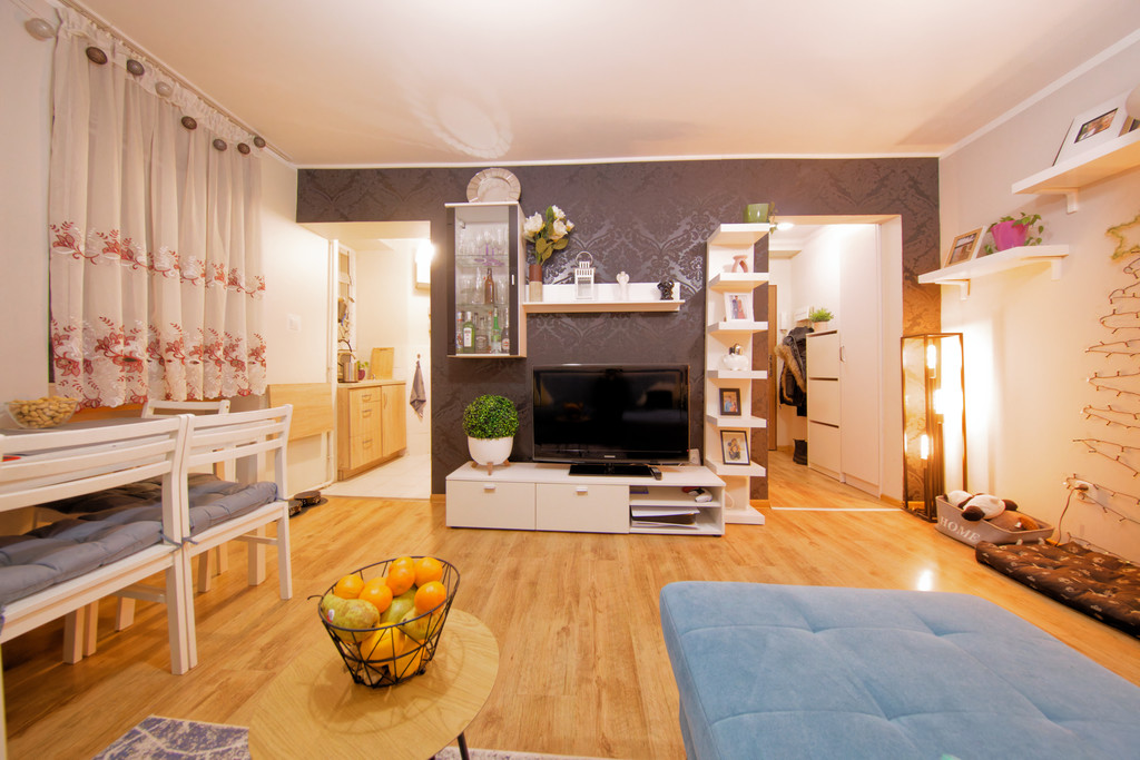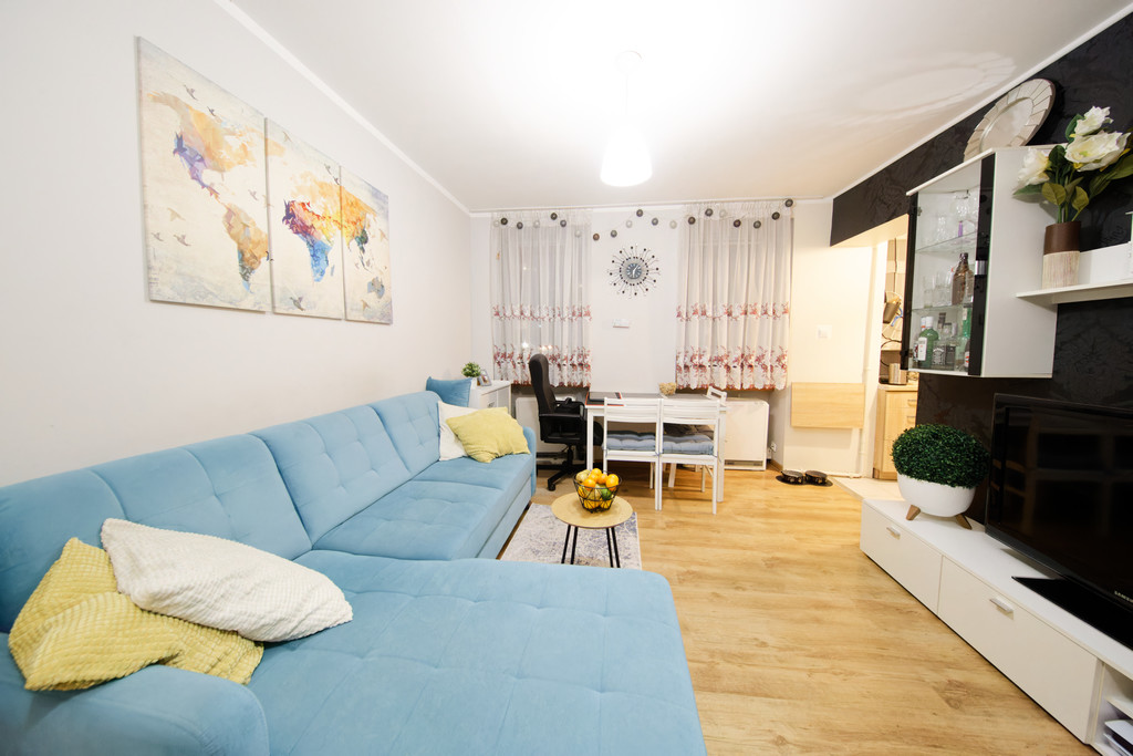 Mieszkanie składa się z dwóch urokliwych pokoi – salonu i sypialni, funkcjonalnej kuchni oraz łazienki.