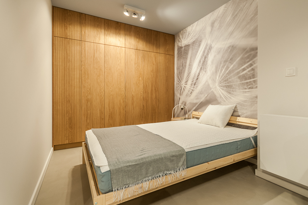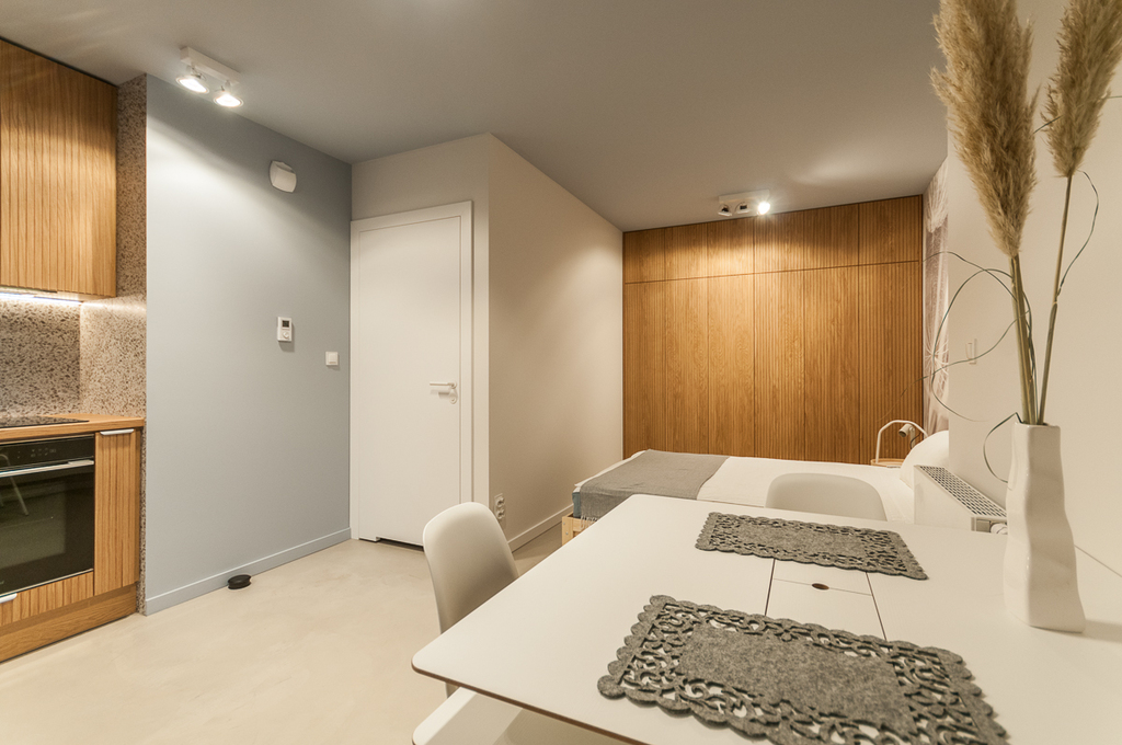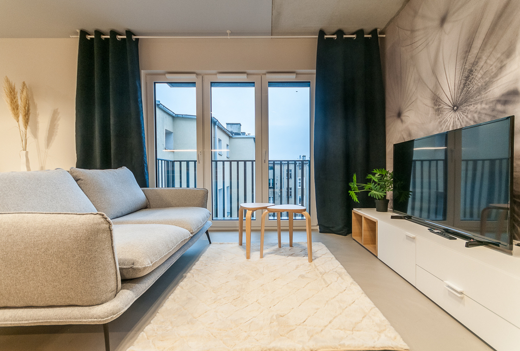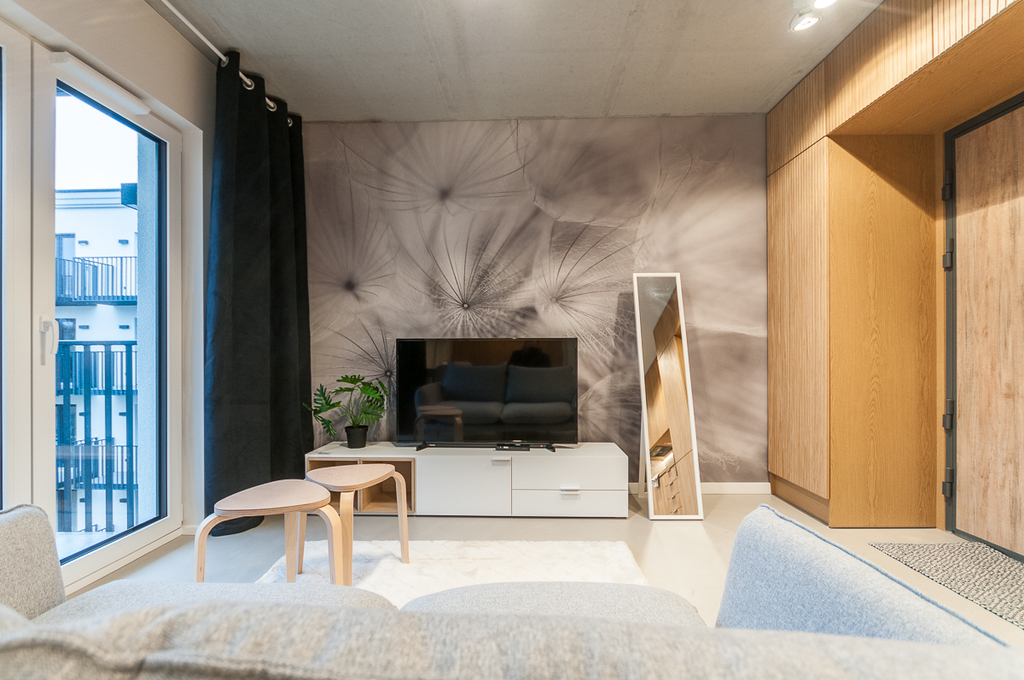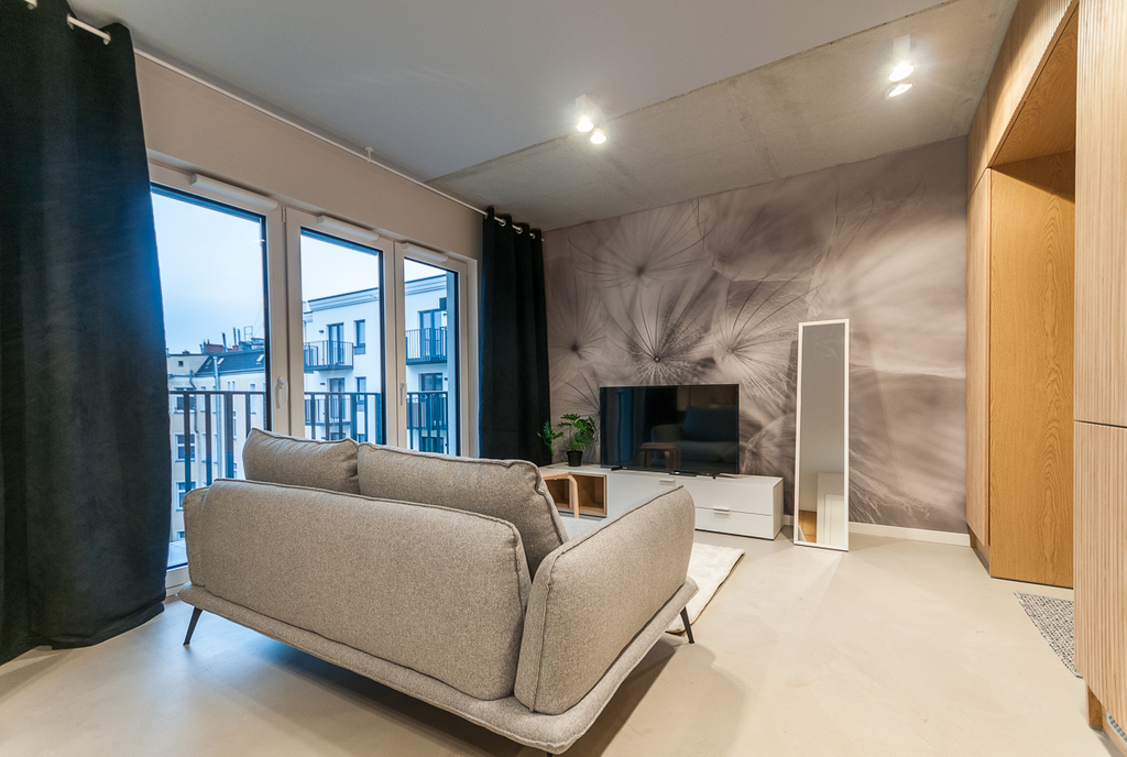 Mieszkanie w pełni umeblowane, częściowo wyposażone - od nowości niezamieszkane przez nikogo. Wnętrze zaprojektowane przez architekta wnętrz z wykorzystaniem materiałów wysokiej jakości - meble kuchenne i szafy robione na wymiar wykonane w okleinie z drewna naturalnego (fornir), nowoczesne oświetlenie ledowe, na podłodze specjalna posadzka betonowa.