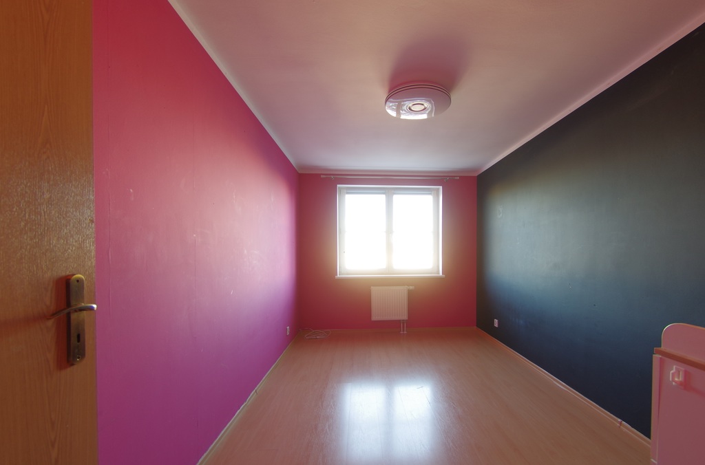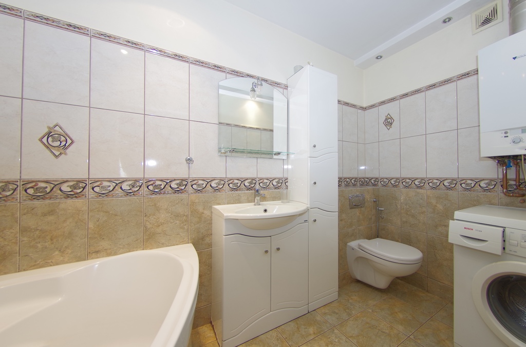 Na podłogach panele, ściany malowane, łazienka w glazurze i terakocie- wanna narożna.