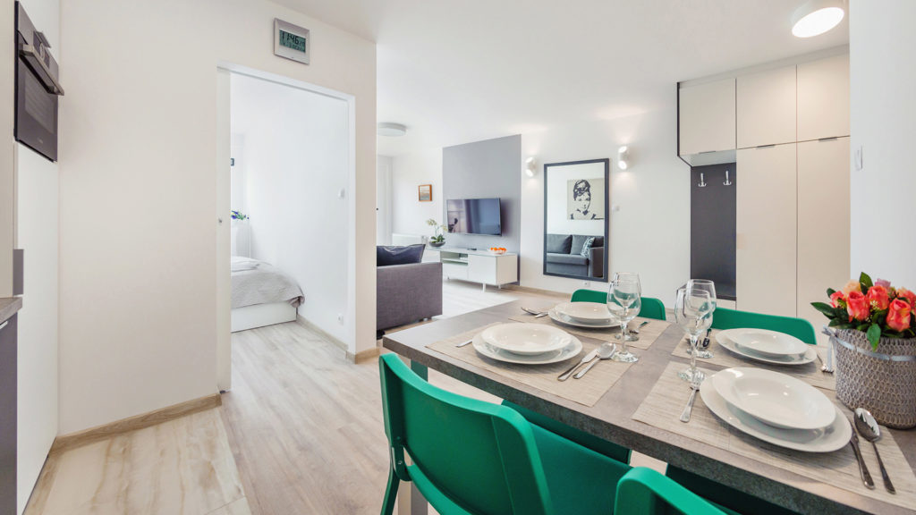 Składa się z salonu z pełni wyposażonym aneksem kuchennym, sypialni, łazienki oraz przestronnego balkonu.
