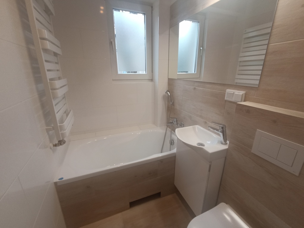 Niezależna kuchnia z oknem, nowe meble i nowy sprzęt agd (kuchenka gazowa, okap, lodówko-zamrażarka). Łazienka z wanną, umywalką, razem z wc w nowej glazurze i terakocie.