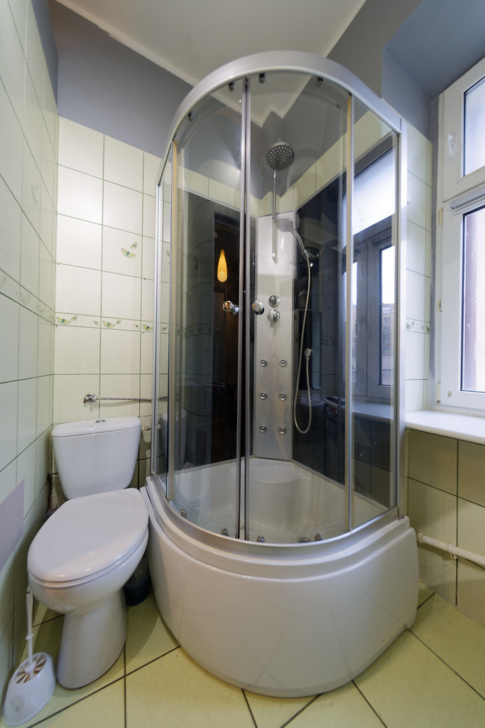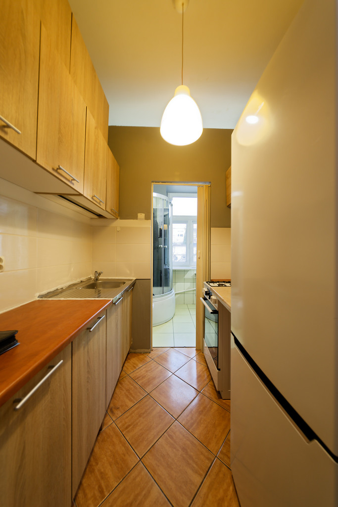Kuchnia wyposażona w szafki, dużą lodówkę z zamrażarką, zlew, palniki gazowe z elektrycznym piekarnikiem będące jednocześnie przejściem do łazienki z toaletą umywalką i prysznicem z masażami.