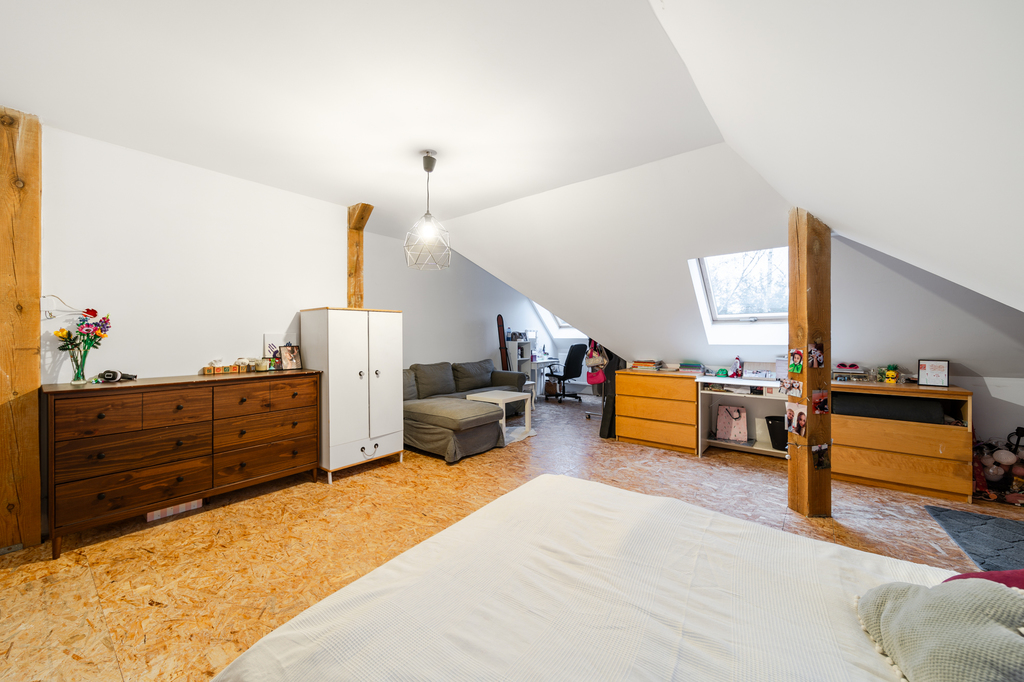 Na pierwszym piętrze znajdują się trzy sypialnie, jedna garderoba oraz łazienka.