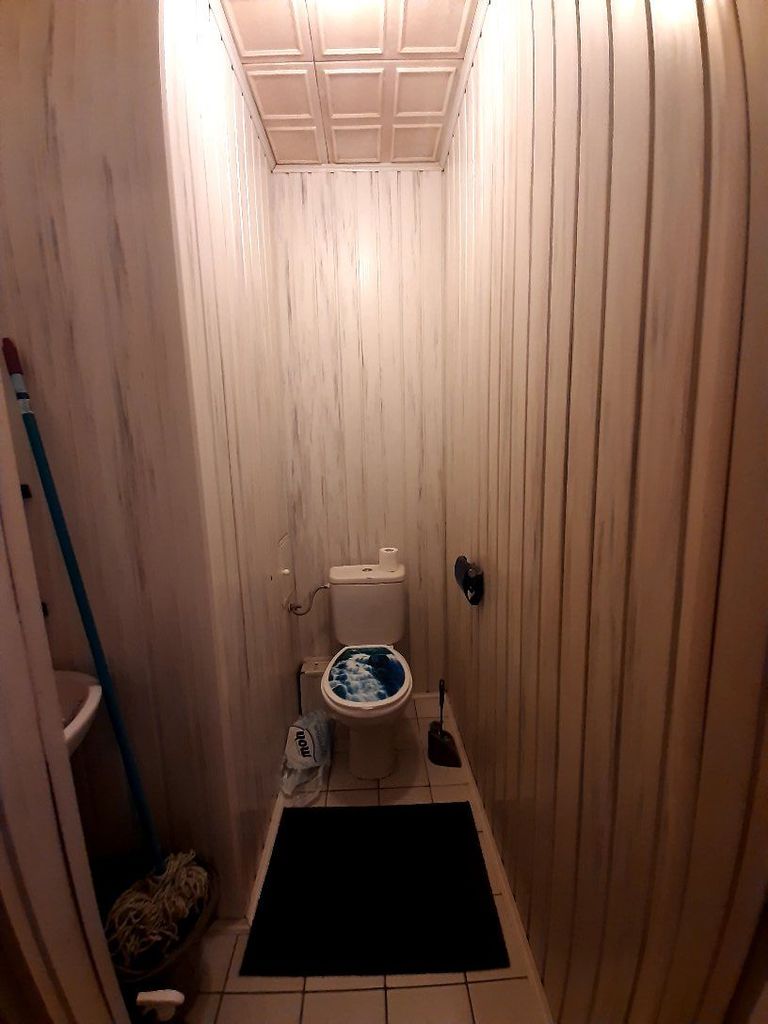 Łazienka i wc osobno, na podłogach terakota, na ścianach i suficie panele. W przedpokoju na podłodze panele, ściany wytapetowane.