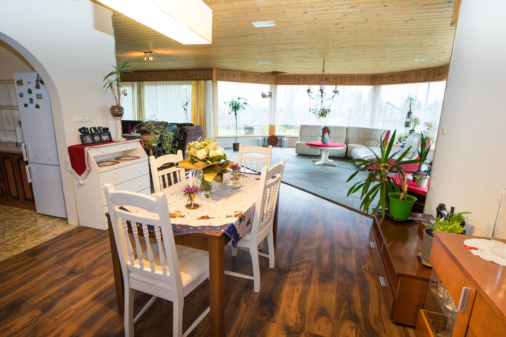 Dom jest idealnie naświetlony dzięki dużej ilości okien co daje poczucie przestrzeni. Salon połączony jest z jadalnią oraz strefą wypoczynkową