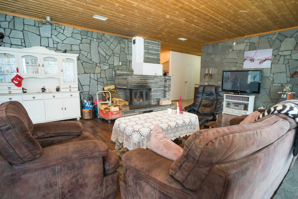 z kominkiem. Właściciel większość materiałów do budowy domu sprowadził z Norwegii jak również materiały do wyposażenia domu.