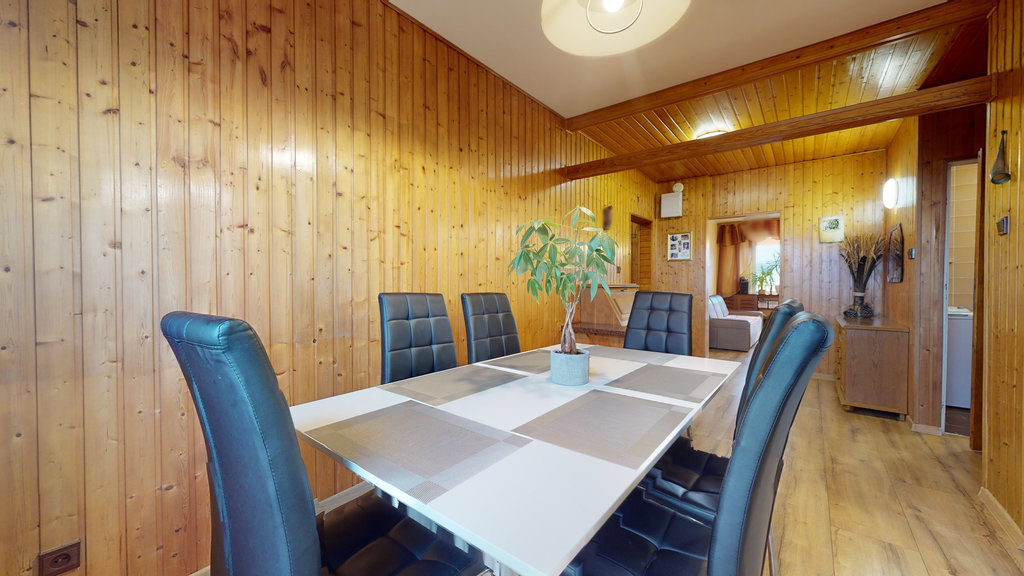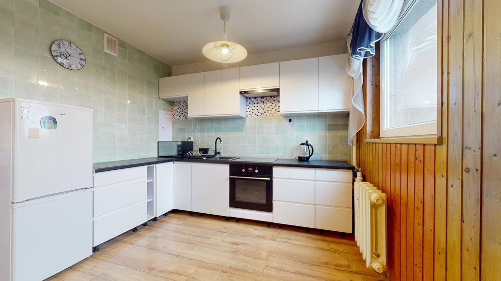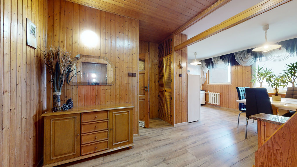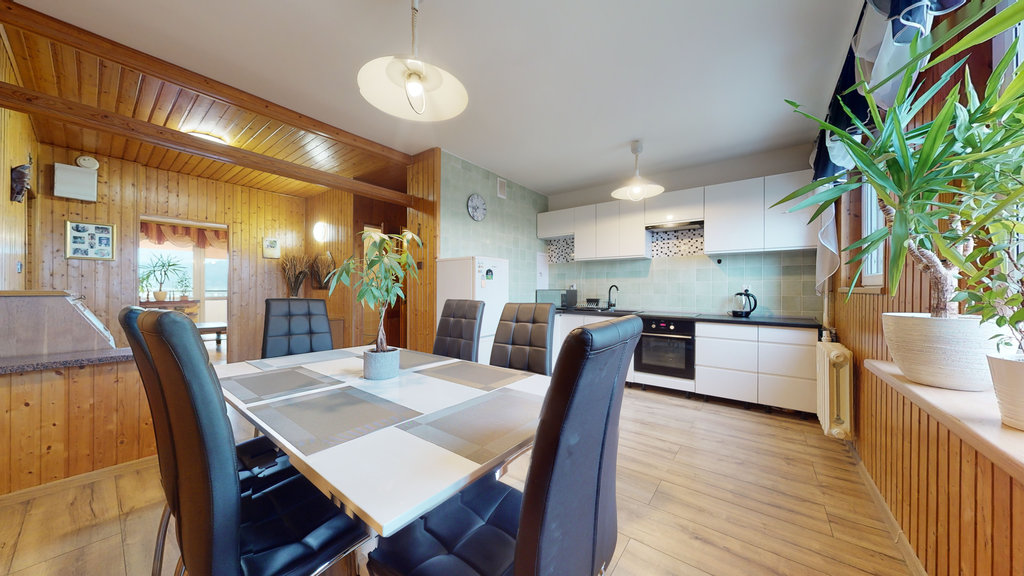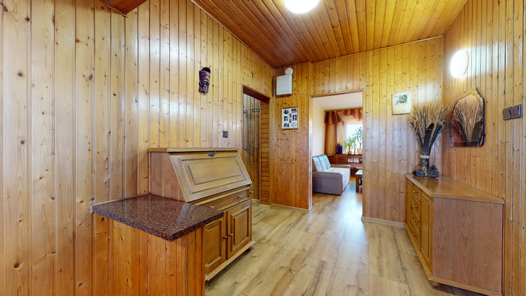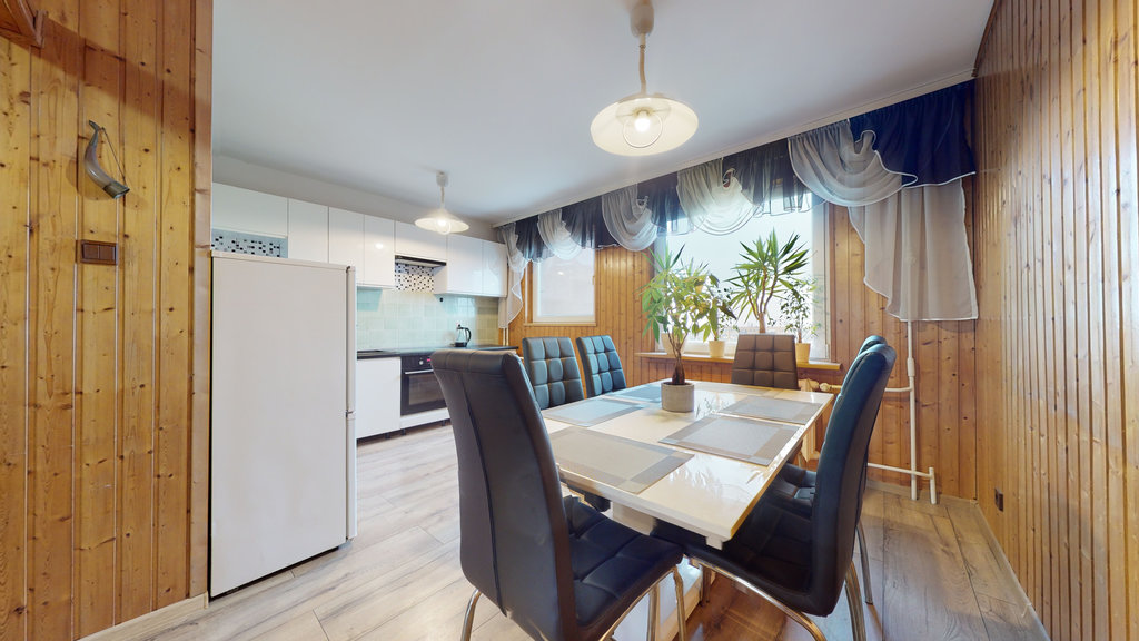 Na niemal całej podłodze (poza łazienką i toaletą) jednakowe, bardzo dobrej jakości panele, ściany malowane. W jadalniani i przedpokoju boazeria. W części kuchennej, łazience i toalecie kafle na ścianach. Nowoczesna zabudowa kuchenna 2-letnia, wyposażona w zmywarkę, płytę indukcyjną, piekarnik.
