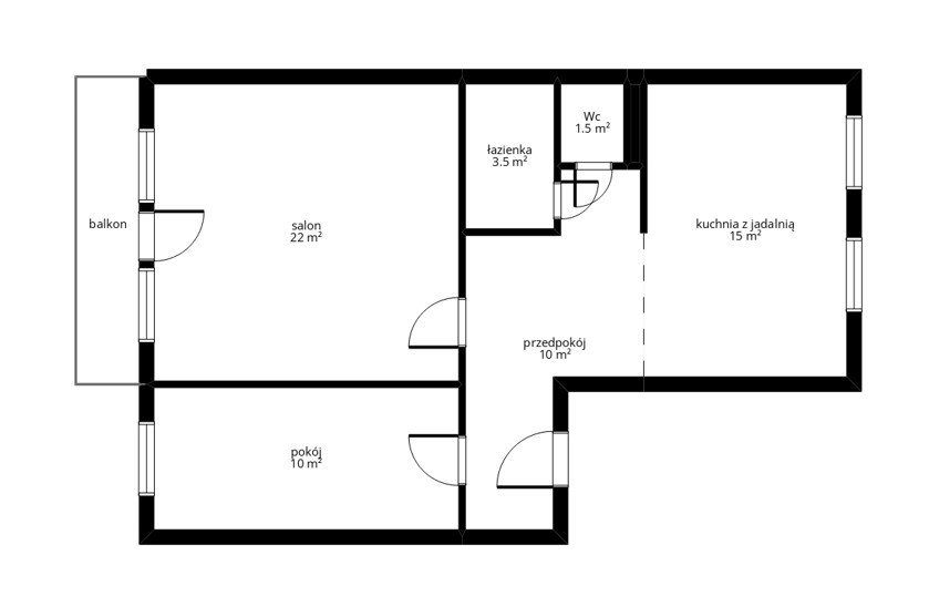 Na powierzchnię 62,2m2 składają się: salon 22m2, sypialnia 10m2, oraz kuchnia połączona z jadalnią 15m2, łazienka 3,5m2, Wc i przedpokój. Pierwotnie były to 3 pokoje z osobną kuchnią.