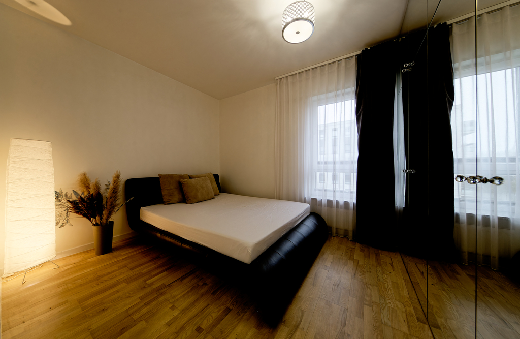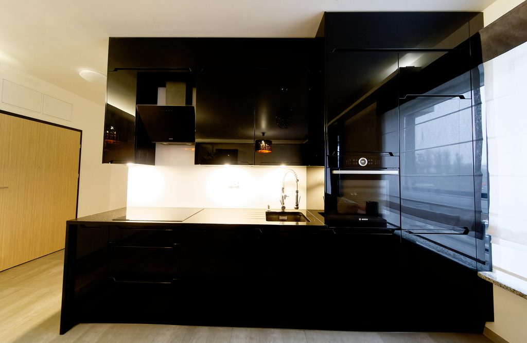 Meble kuchenne oraz szafy w stałej zabudowie w cenie mieszkania w tym łóżko z skóry naturalnej w sypialni.