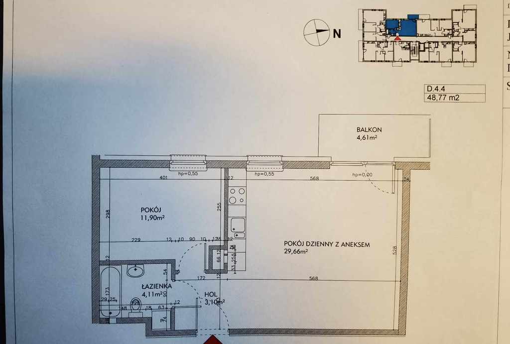 Z salonu wyjście na balkon (4,61m2). Na podłodze w salonie, kuchni i przedpokoju oraz łazience Gres Paradyż, w sypialni podłoga z deski.