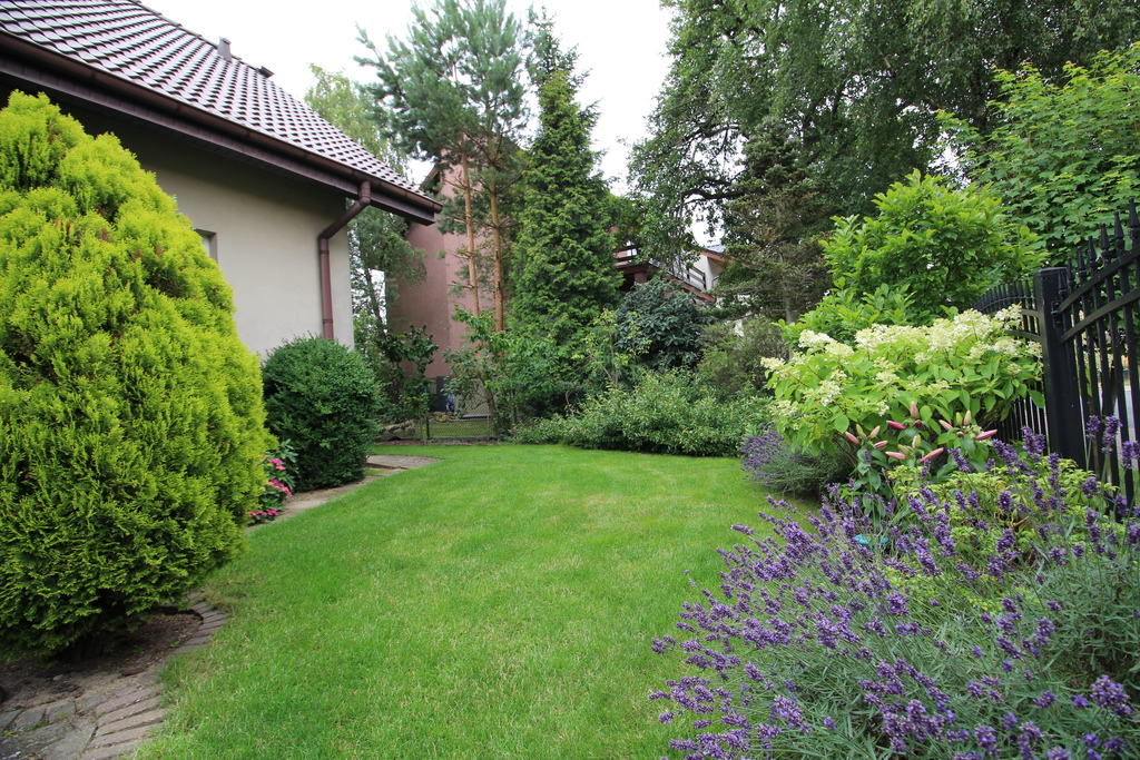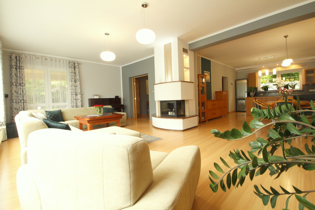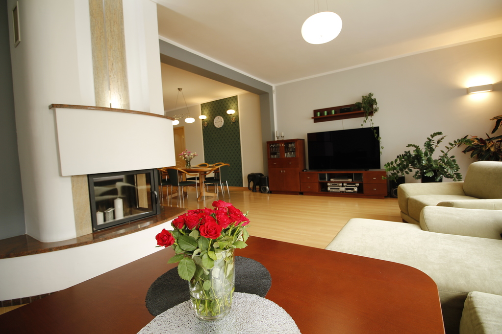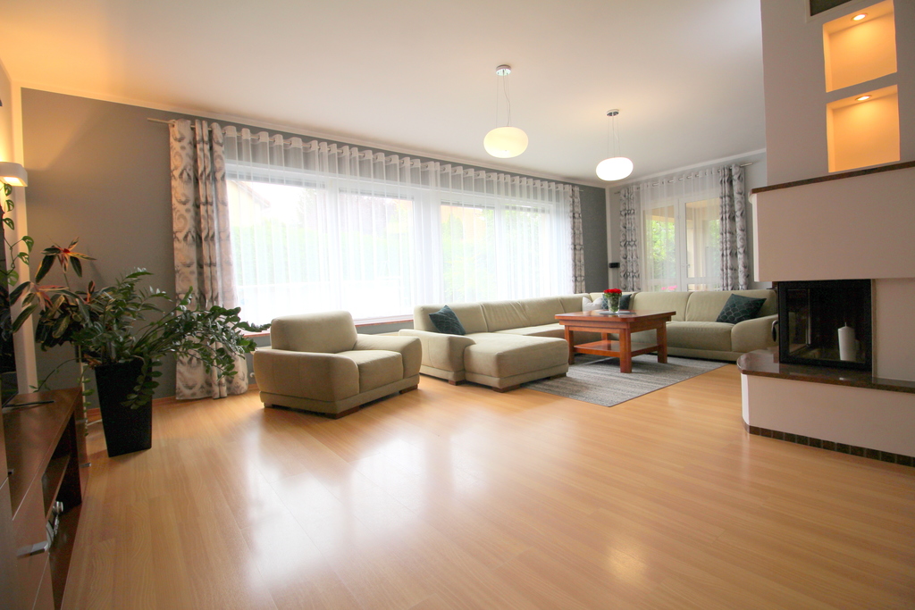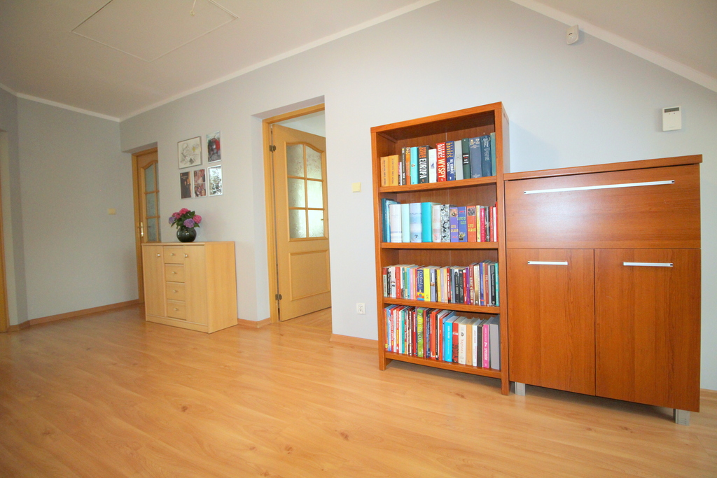 Dom wybudowany w 2000 roku z Porothermu, posadowiony na działce o powierzchni 817 mkw. Duży ogród z pięknie zagospodarowaną zielenią, dużą ilością nasadzeń, miejscem do wypoczynku i rekreacji. Na ogrodzie zlokalizowany domek ogrodowy, z miejscem na narzędzia, kosiarkę, drewno itp. Duży salon z kominkiem, wyprowadzenie ciepła także na hol na piętrze. Z salonu wyjście na taras.