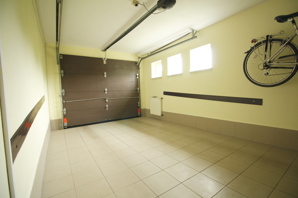 Garaż jednostanowiskowy w bryle budynku z podjazdem wyłożonym polbrukiem, plus dodatkowo wiata na 2 samochody. Brama garażowa oraz główna wjazdowa automatyczne, dodatkowa brama wjazdowa z dostępem do wiaty.