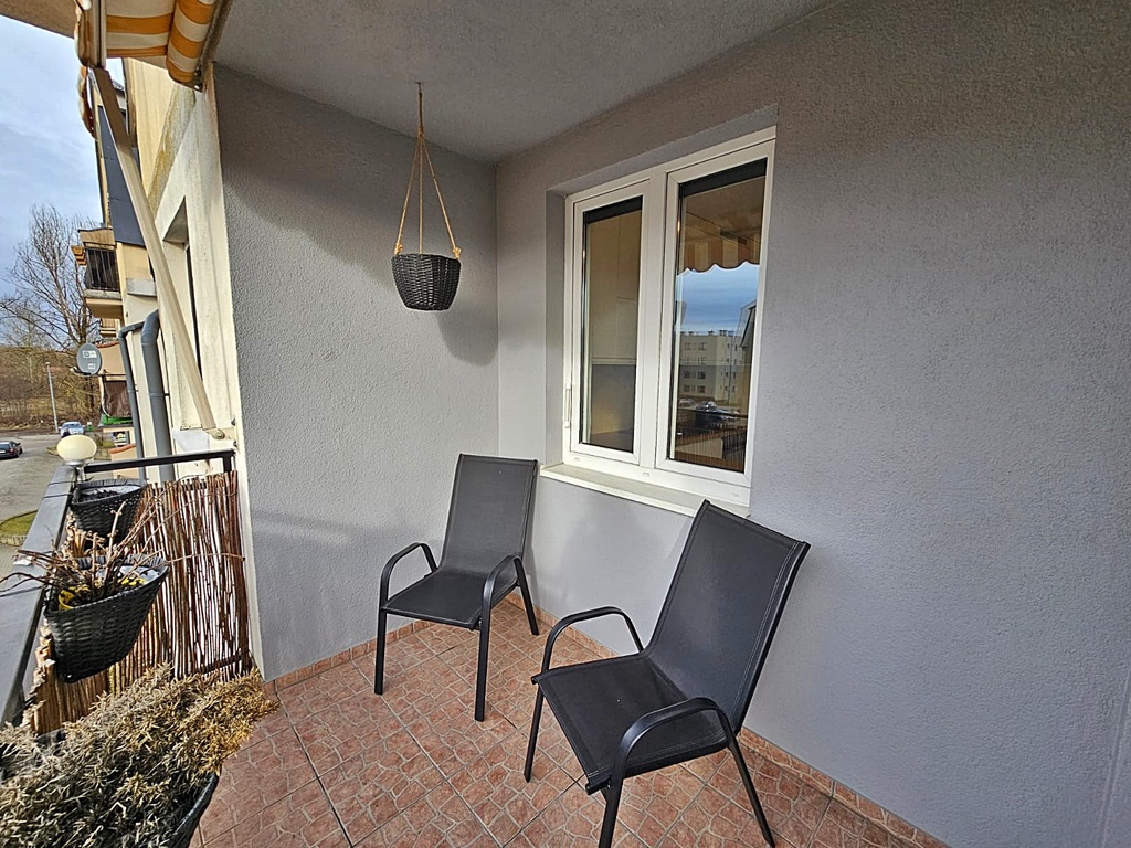 Z salonu jest wyjście na  przestronny balkon wyposażony w zamontowaną markizę chroniącą latem przed słońcem.