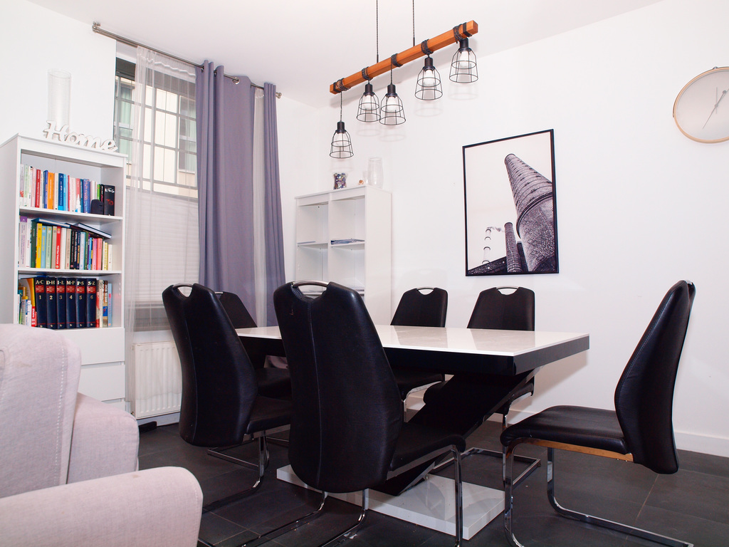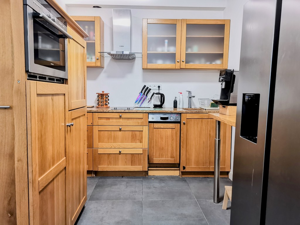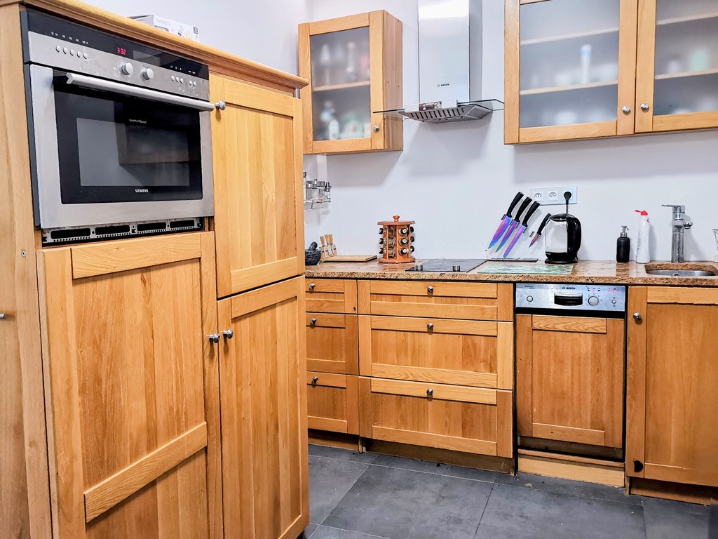 Nowoczesna kuchnia o powierzchni 8 m2 została wyposażona w sprzęt wysokiej jakości. Znajdziemy tu piekarnik z funkcją kuchenki mikrofalowej, płytę indukcyjną, zmywarkę, lodówkę z dozownikiem wody i kostkarką oraz dużą zamrażarkę. To idealne miejsce dla miłośników gotowania.