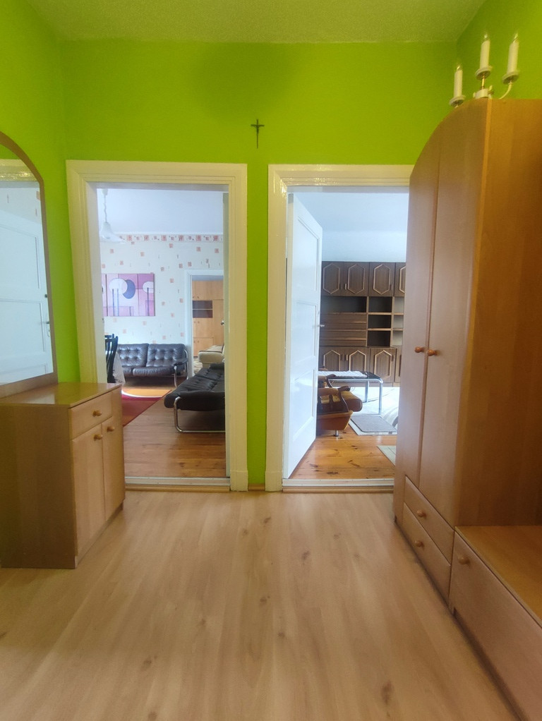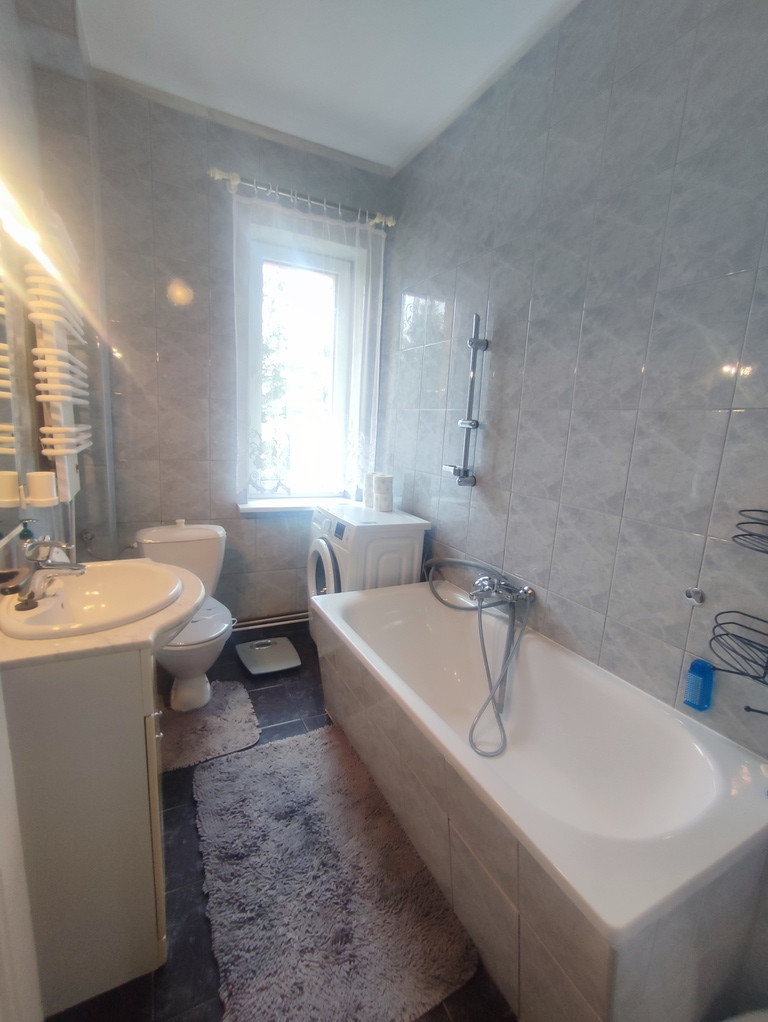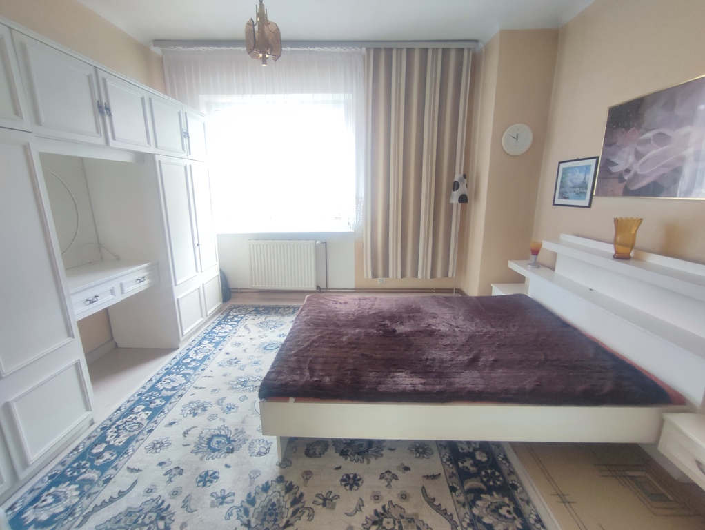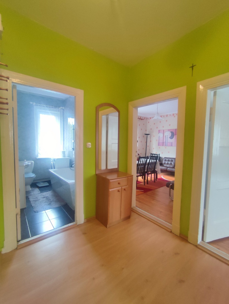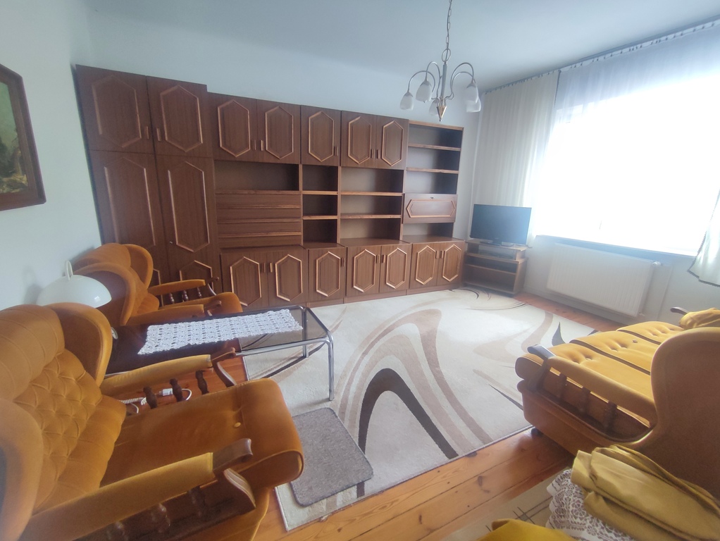 Mieszkanie jest bardzo zadbane choć większość materiałów wykończeniowych oraz mebli jest starszego typu. W trzech pokojach oryginalne deski na podłodze plus dywany. W czwartym pokoju nowsze panele na podłodze. Na ścianach tapety (m.in. raufaza). Mieszkanie oferowane jest w pełni umeblowane (meble starszego typu, które na życzenie nowego właściciela mogą pozostać w cenie - np. pod kątem zakupu inwestycyjnego jako mieszkanie pod wynajem). W kuchni panele na podłodze oraz pas kafelek na ścianie plus meble kuchenne, sprzęt AGD (lodówka firmy Gorenje, kuchenka elektryczna Amica), zlewozmywak, stół i cztery krzesła. W łazience glazura i terakota plus wanna, umywalka z szafką, muszla, pralka firmy Samsung oraz grzejnik drabinkowy.