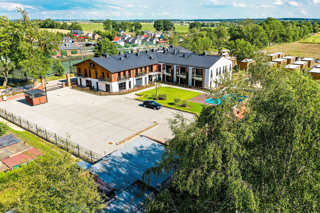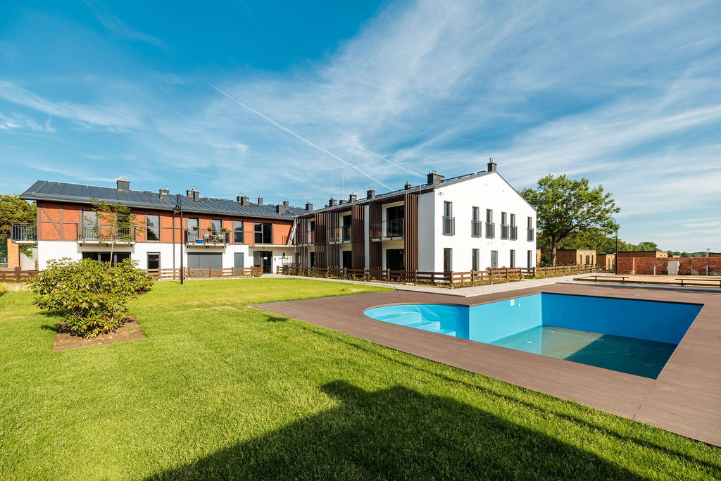 Proponowany apartament jest częścią inwestycji obejmującej 24 apartamenty o powierzchni od 29 m2 do 66,5 m2. Budynek stoi w miejscu pałacowej stajni i jest połączeniem nowoczesności z klimatem pobliskiego pałacu. Mur pruski oraz liczne drewniane elementy przepięknie nawiązują do byłej oraz istniejącej zabudowy.