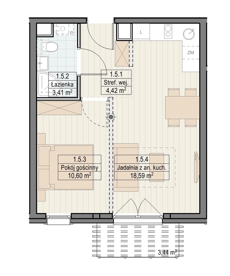 Apartament będący przedmiotem tej oferty znajduje się na piętrze i ma powierzchnię 37,02 m2. Składa się z salonu z aneksem kuchennym, sypialni, łazienki i przedpokoju.