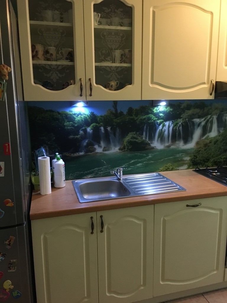 Kuchnia jest zabudowana meblami na wymiar, na ścianie panele ze szkła hartowanego.