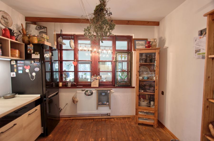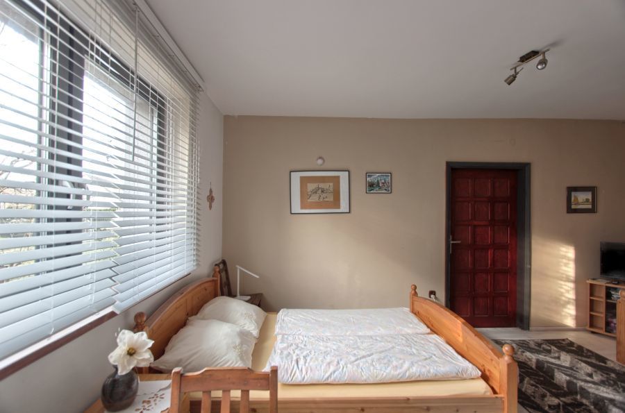 Wchodząc do domu przechodzimy przez przeszklony ganek i dalej kierujemy się w stronę otwartej kuchni połączonej z jadalnią. Pół piętra wyżej znajduje się salon, z którego jest przejście do sypialni oraz łazienki i oddzielnej toalety. Powyżej, postawiona jest duża szafa z miejscem na garderobę oraz wejście do dwóch kolejnych sypialni, z czego jedna posiada wyjście na taras. Ta część domu stanowi część mieszkalną obecnych właścicieli. Natomiast poniżej mieszczą się dwa oddzielne apartamenty, które w sezonie letnim wynajmowane są przez booking.com.