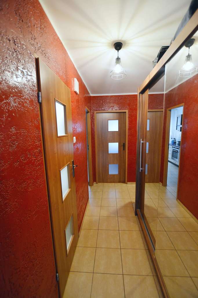 Okna pcv. Na podłogach panele, w kuchni, przedpokoju, łazience i WC kafle.
