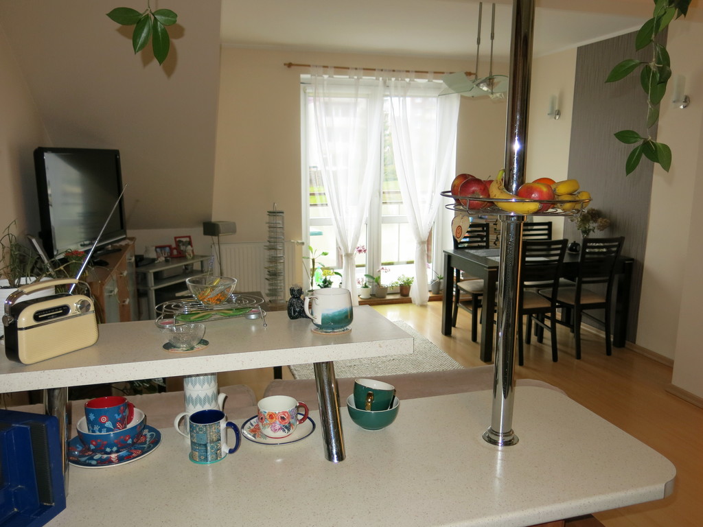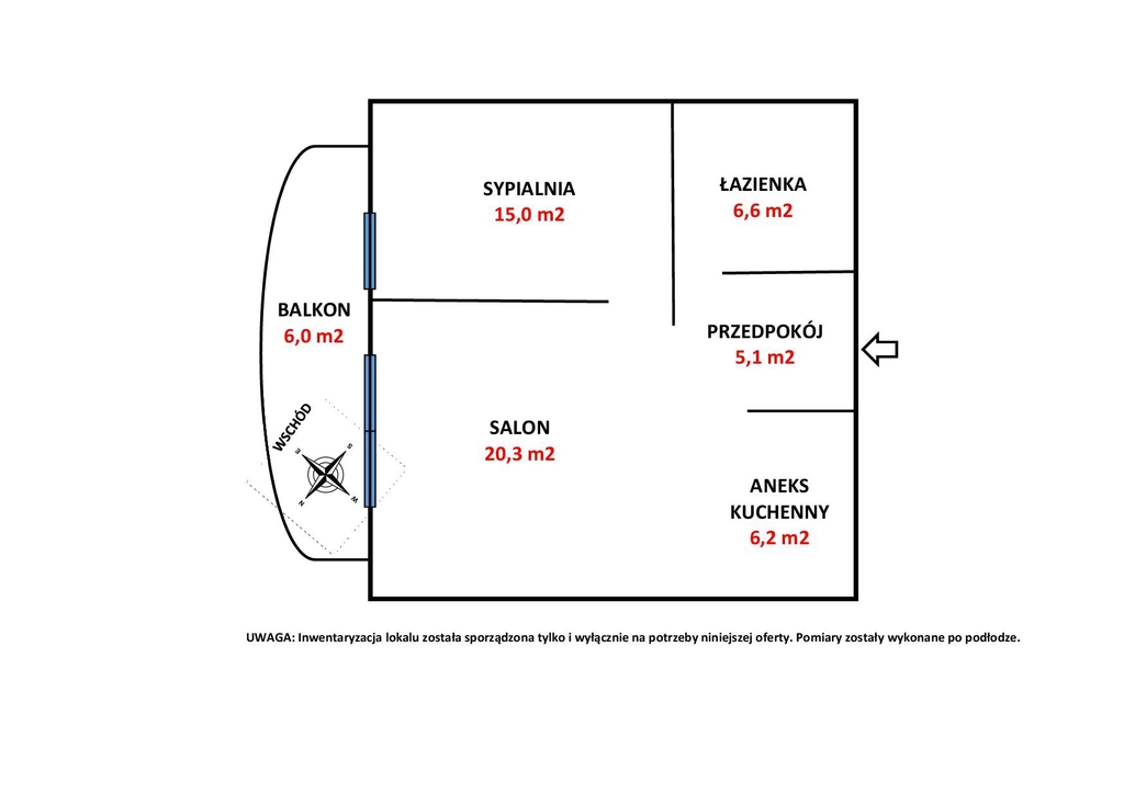 Mieszkanie składa się z salonu (o powierzchni 20,3m2) z aneksem kuchennym (o powierzchni 6,2m2), drugiego pokoju - sypialni (o powierzchni 15,0m2), łazienki (o powierzchni 6,6m2) oraz przedpokoju (o powierzchni 5,1m2). Z obu pokoi wyjście na duży balkon (o powierzchni ok. 6m2). Wszystkie okna (PCV) od strony zachodniej.