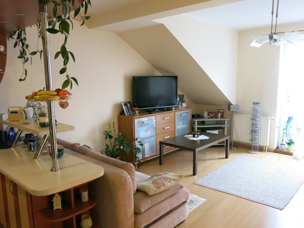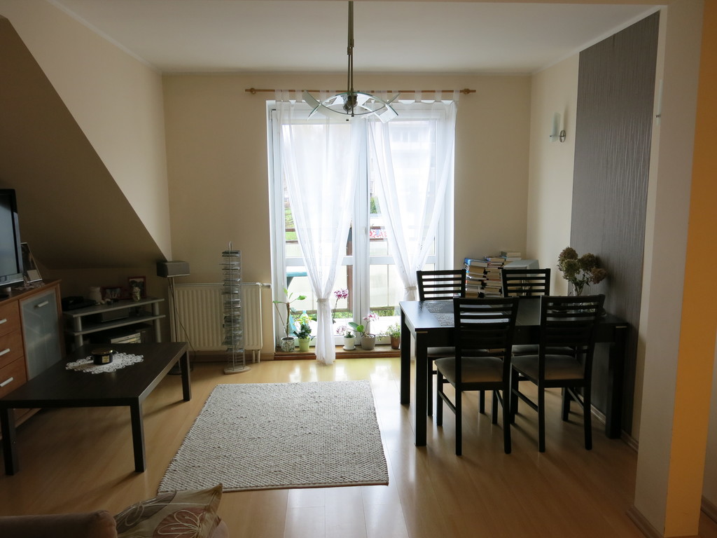 Mieszkanie o powierzchni użytkowej 51,49m2 (powierzchnia całkowita mieszkania mierzona po podłodze jest większa o kilka metrów od powierzchni użytkowej, a skosy są nieuciążliwe, ponieważ występują tylko na bocznych ścianach w obu pokojach).