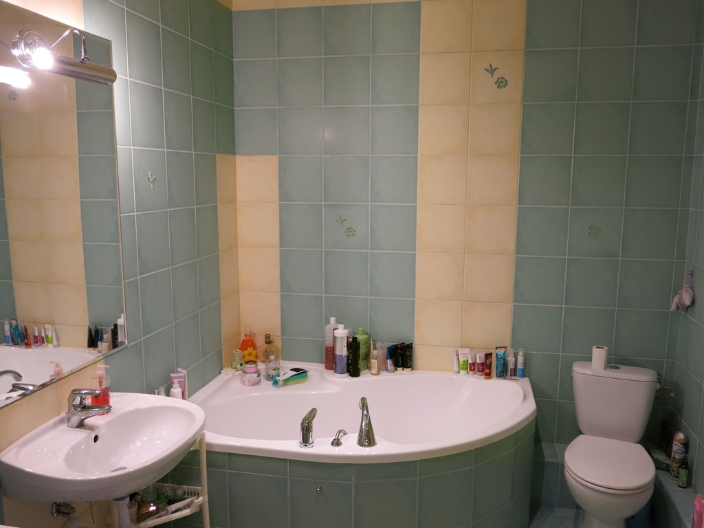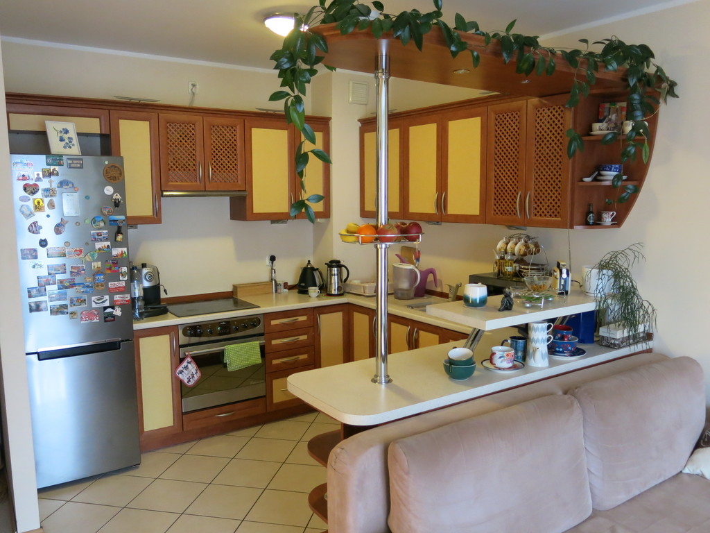 Mieszkanie do odświeżenia lub do remontu (jest zadbane, lecz zostało wykończone w 2003 roku). W pokojach na podłodze znajdują się panele. W pozostałych pomieszczeniach (w aneksie kuchennym, w przedpokoju i w łazience) na połogach znajduje się terakota. Ściany w całym mieszkaniu gładzone (w salonie pasy ozdobnej tapety, w łazience ściany obłożone glazurą na całej wysokości i szerokości). Obecnie pokoje są przechodnie (z salonu wchodzimy do sypialni), lecz pierwotnie projekt zakładał wejście z przedpokoju i istnieje możliwość powrotu do tej koncepcji, aby pokoje były rozkładowe (aktualnie w przedpokoju w miejscu planowanych drzwi do sypialni znajduje się wbudowana szafa). Aneks kuchenny wyposażony w zlewozmywak, zmywarkę (45cm), kuchenkę elektryczną, piekarnik. Duża łazienka wyposażona jest zarówno w wannę jak i w kabinę prysznicową. Znajduje się w niej piec gazowy dwuobiegowy zasilający mieszkanie w ciepłą wodę i ogrzewanie.