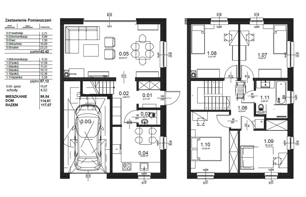 Salon 23.23m2 , wiatrołap 2,71m2, komunikacja 4,89m2, wc 1,50m2, kuchnia 10,09m2