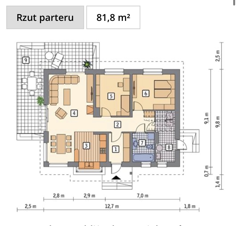 Budynek znajduje się na działce o powierzchni 1000 mkw, powierzchnia całkowita domu wynosi 137,60 mkw, użytkowa 129,60 mkw.