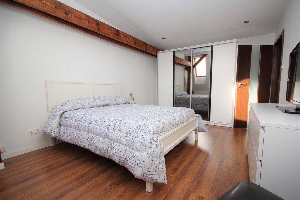 *sypialnia z dużym komfortowym łóżkiem i zabudowaną szafą z przesuwnymi drzwiami