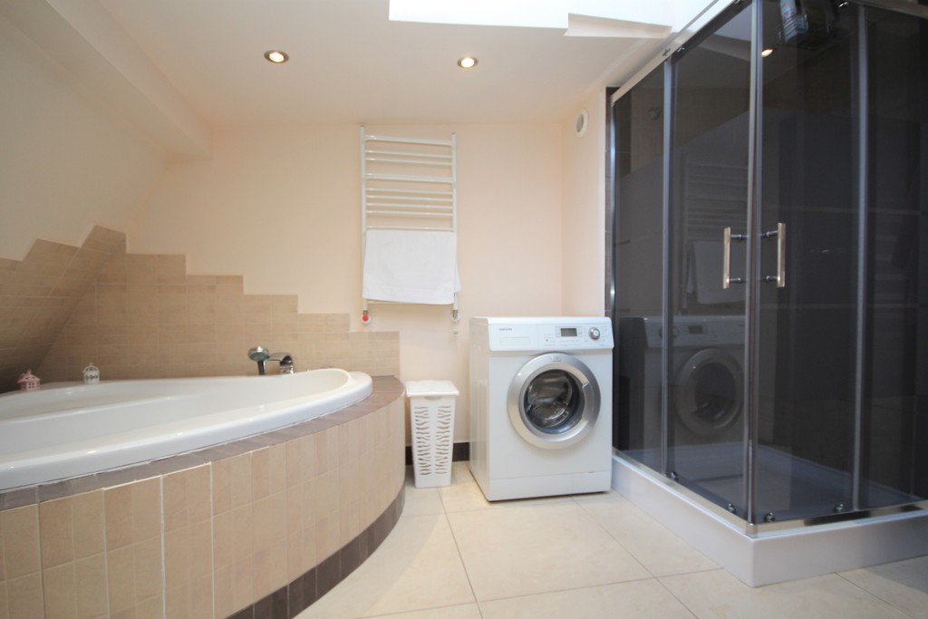 *łazienka wyposażona w: kabinę prysznicową i narożną wannę