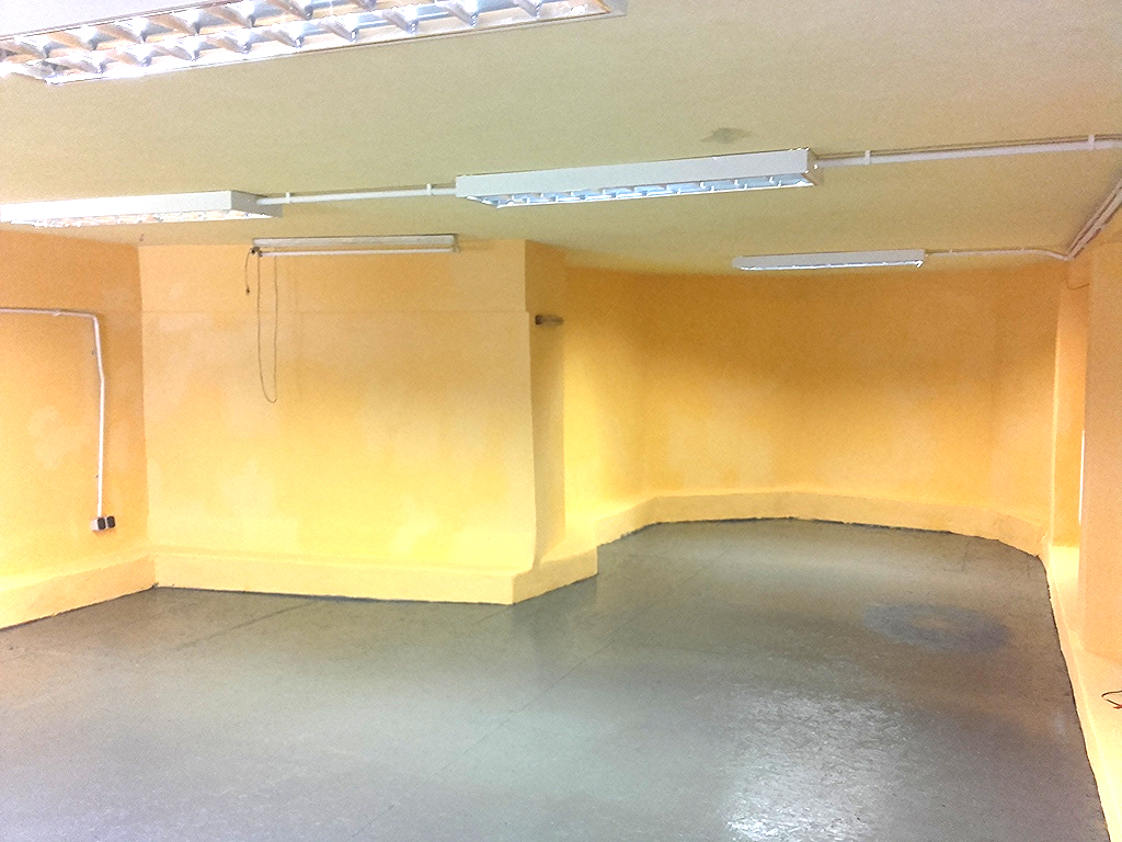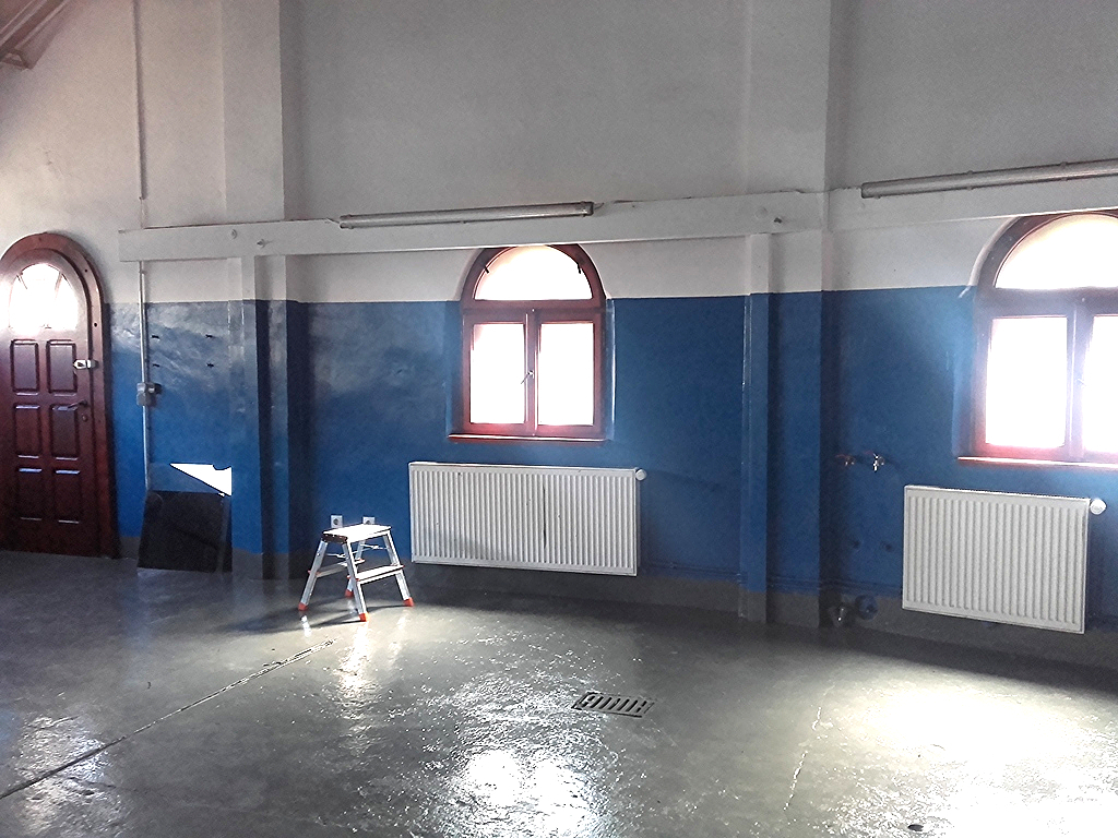 W lokalu woda, gaz, prąd (siła), instalacja sprężonego powietrza, w dużej hali (80m2) podłoga betonowa z 4 odpływami.