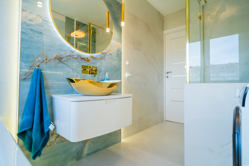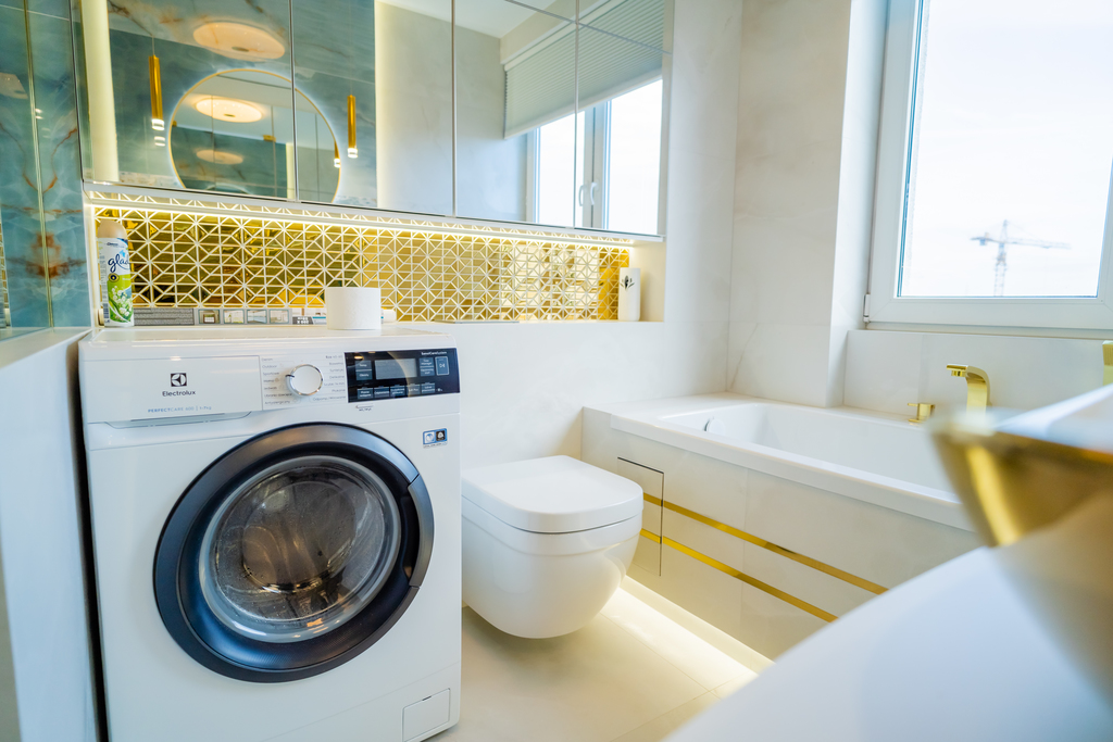 >> Łazienka (pralka, kabina prysznicowa, toaleta, umywalka, wanna).