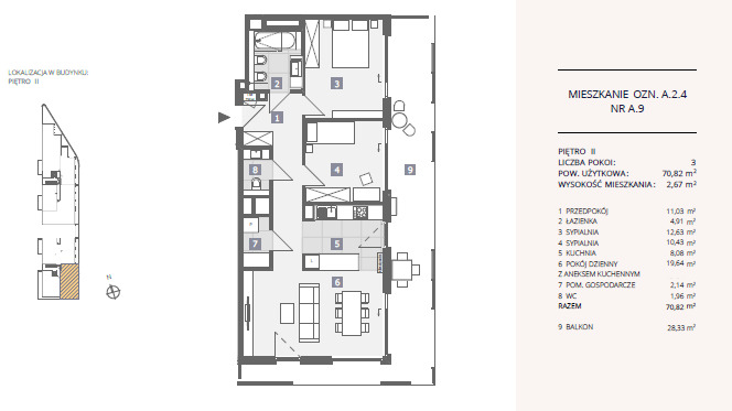 Mieszkanie znajduje się na 2gim piętrze, ma powierzchnię użytkową 70,82 m2 oraz balkon 28,33 m2.