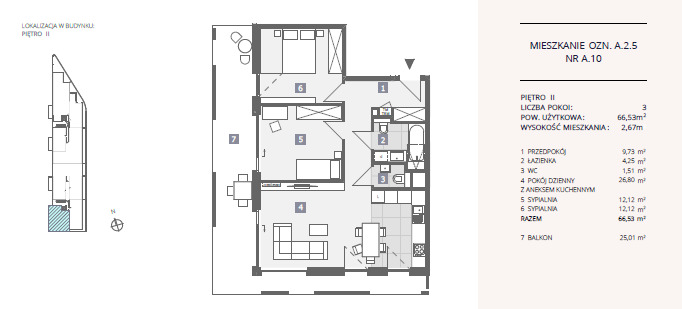 Mieszkanie znajduje się na 2gim piętrze, ma powierzchnię użytkową 66,53 m2 oraz balkon 25,01 m2.