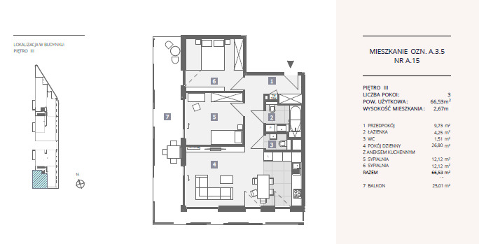 Mieszkanie znajduje się na 3gim piętrze, ma powierzchnię użytkową 66,53 m2 oraz balkon 25,01 m2.