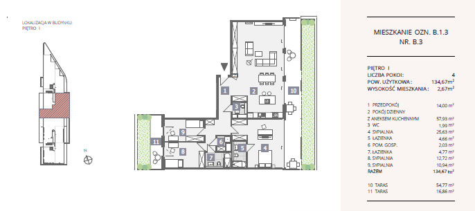 Mieszkanie znajduje się na 1gim piętrze, ma powierzchnię użytkową 134,67 m2 oraz tarasy 54,77 i 16,86 m2.