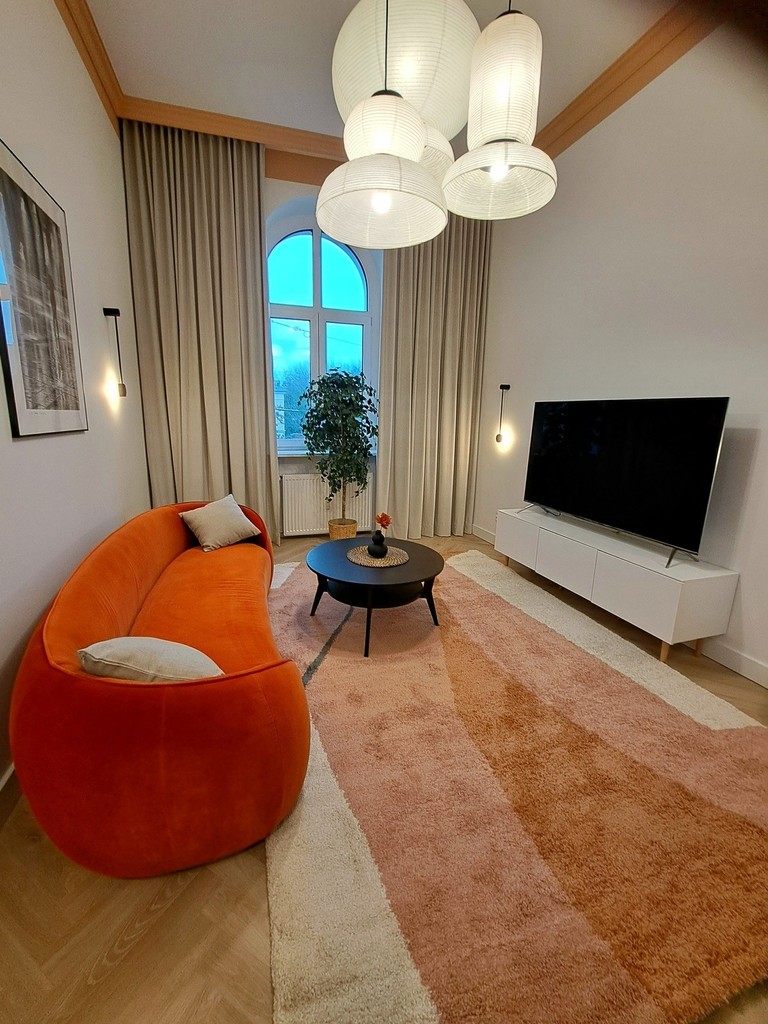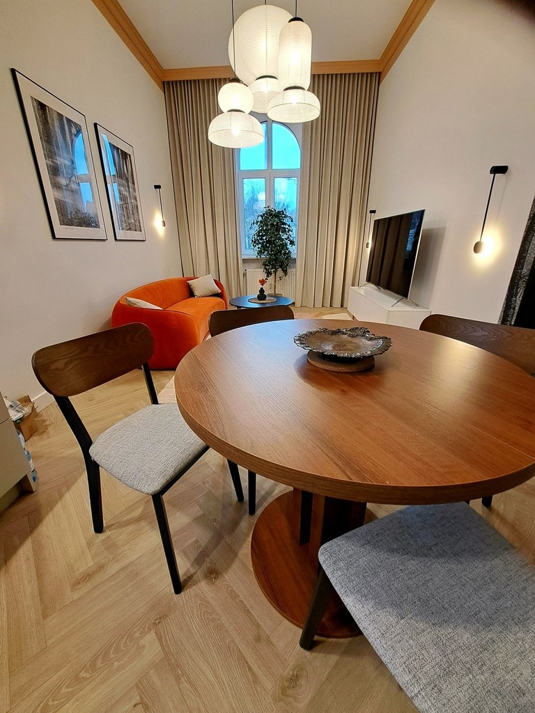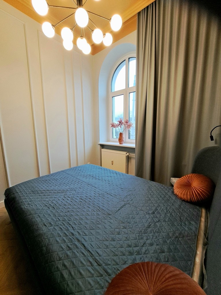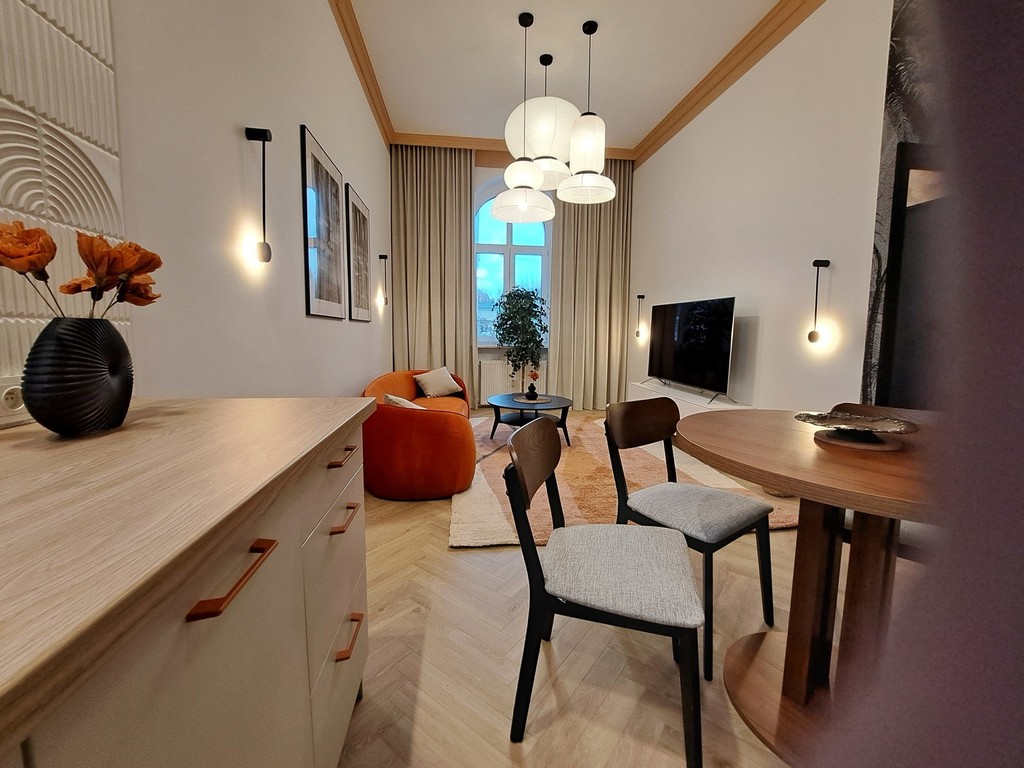 Together with the interior designer, we took care of the style and quality of finishing. The modern and very elegant interior is complemented by original accessories and exclusive lighting, so if you are looking for an extraordinary apartment for rent, you have just found it.