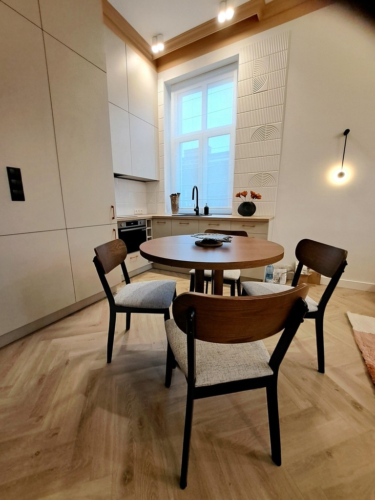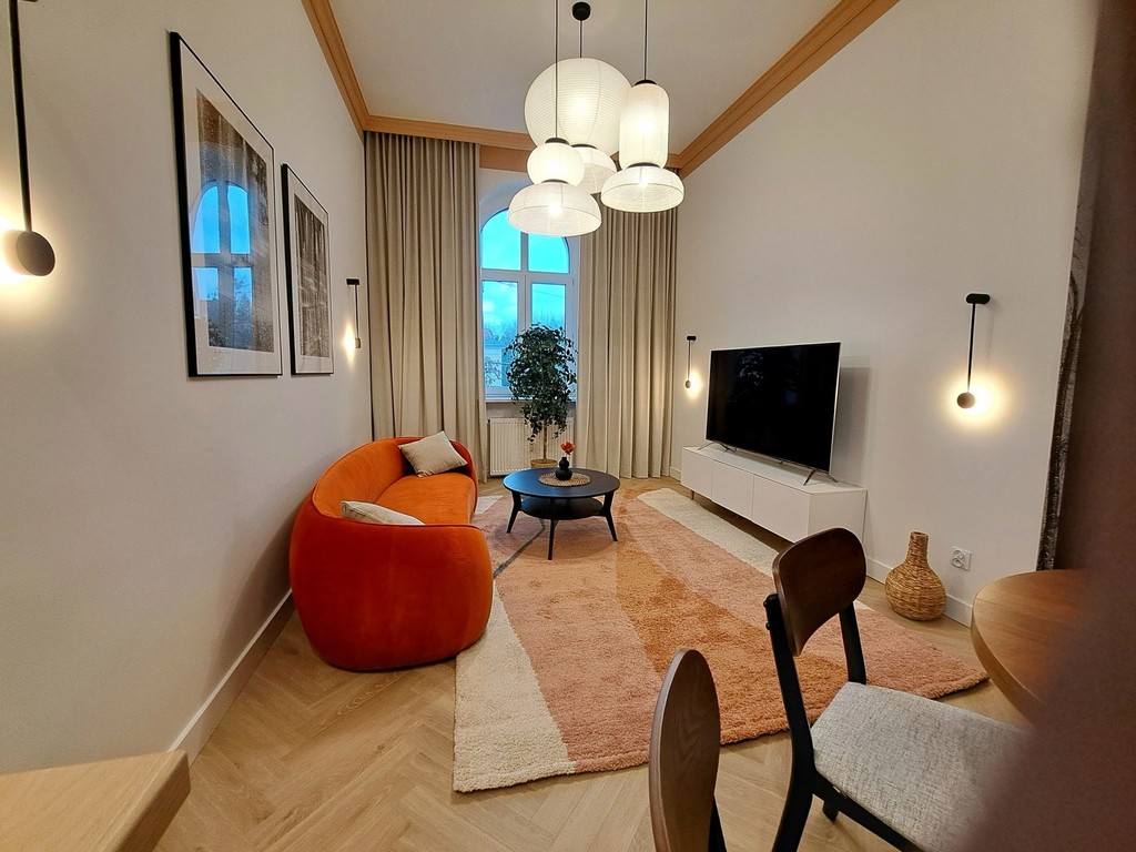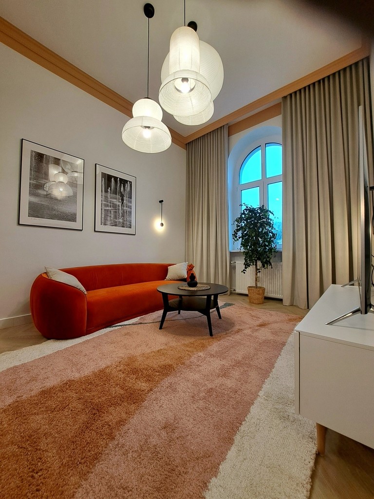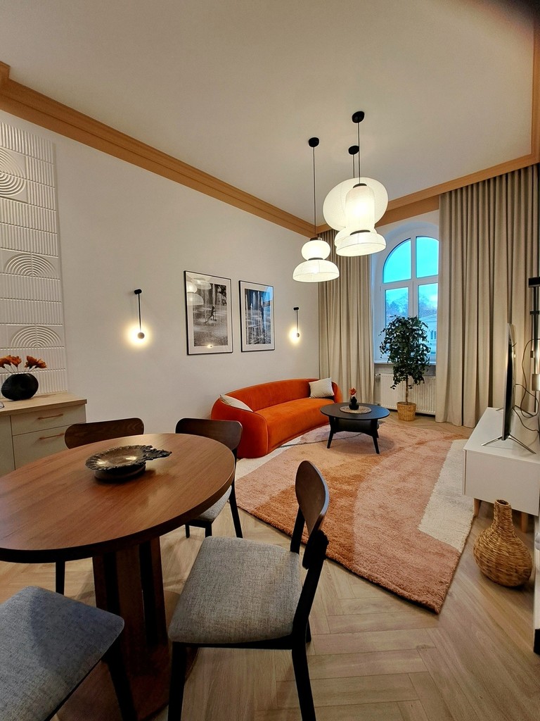 Together with the interior designer, we took care of the style and quality of finishing. The modern and very elegant interior is complemented by original accessories and exclusive lighting, so if you are looking for an extraordinary apartment for rent, you have just found it.