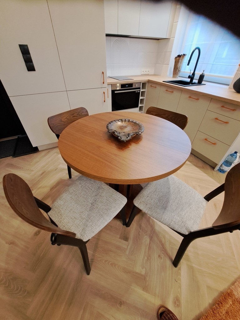 - aneks kuchenny w pełni wyposażony w sprzęt AGD o wysokim standardzie oraz jadalnię z okrągłym stołem z krzesłami