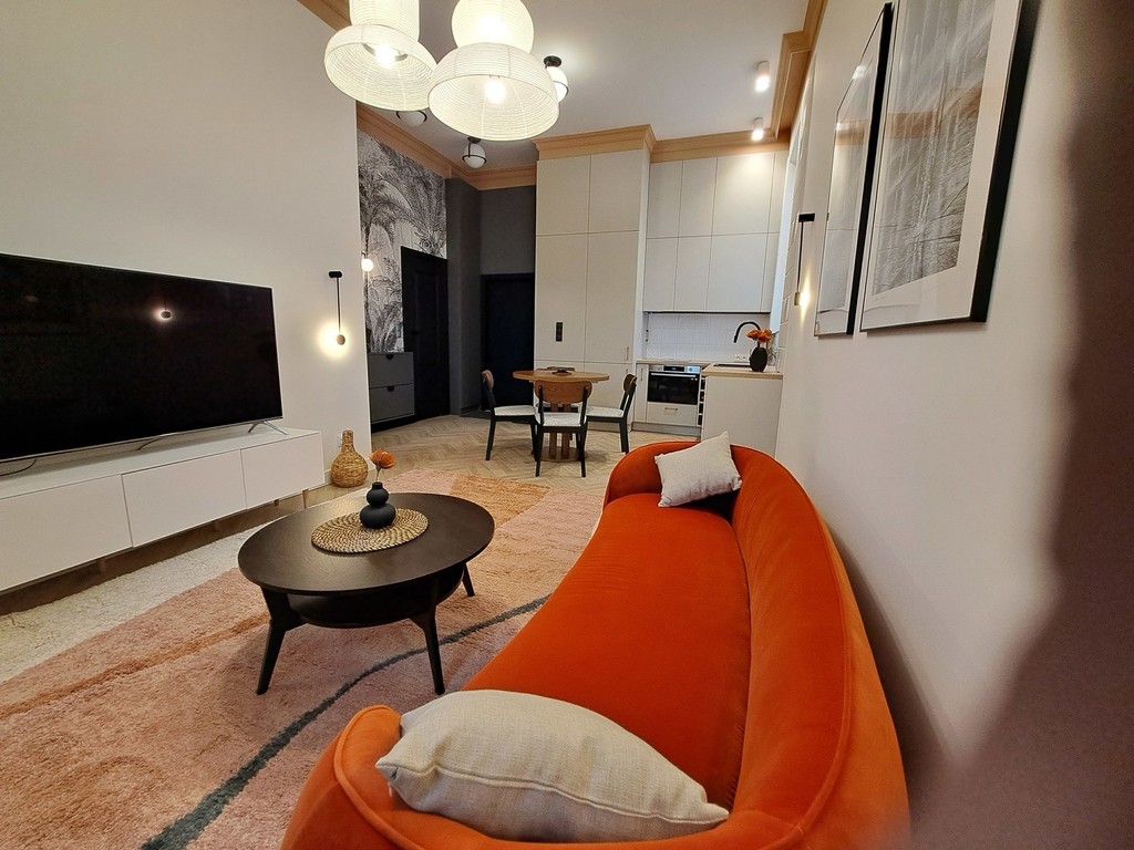 -salon wyposażony w nowoczesną , wygodną sofę w kolorze pomarańczowym , stolik kawowy, duży telewizor , piękne szare zasłony okienne , oryginalne lampy wiszące oraz duże zdjęcia na specjalne zamówienie
