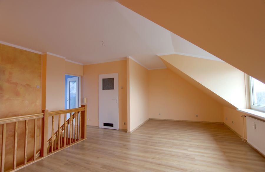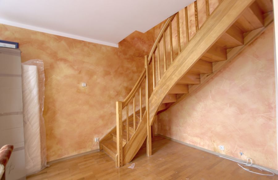Na pierwszym poziomie mieszkania znajdują się salon 21,62m2 z otwartą kuchnią 6,25m2, korytarz 2,34m2, łazienką wyposażoną w wc i umywalkę z miejscem na pralkę 2,55m2 oraz balkon. Z salony prowadzą zabiegowe schody na poddasze. Na górze na wprost schodów znajduje się łazienka 3,62m2 , na lewo sypialnia 11,49m2, na prawo pierwotnie w projekcie dwa pokoje 8,48m2+8,63m2 zaaranżowane jako otwarty pokój o pow. ok. 18 m2 ( możliwość podziału na dwa pokoje, obecnie mieszkanie ma trzy pokoje).
