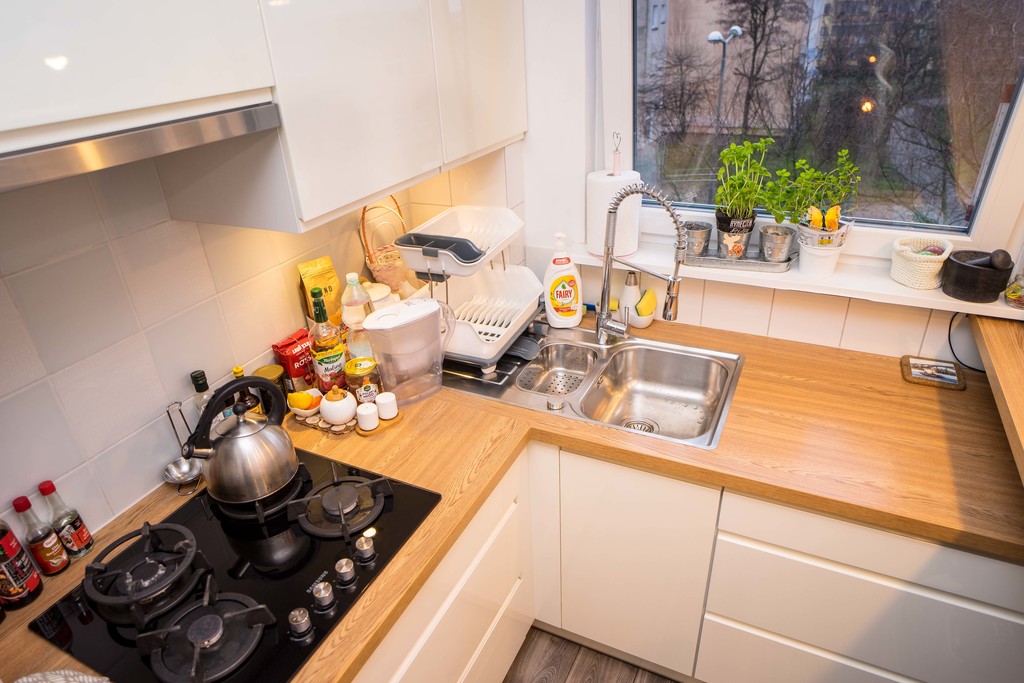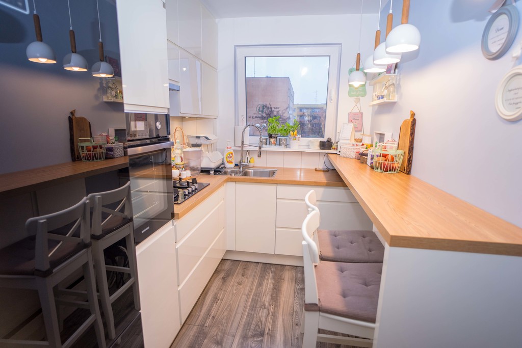 - oddzielna kuchnia z oknem w zabudowie kuchennej ze sprzętem