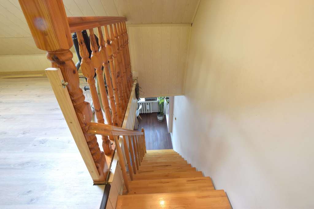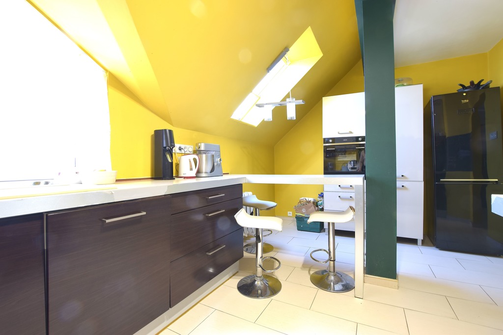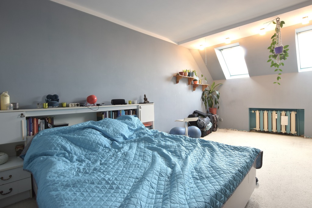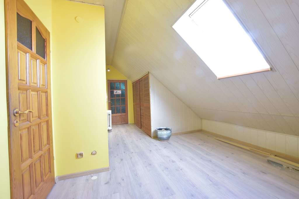 Na podłodze panele, ściany gładkie malowane, okna pcv oraz połaciowe.