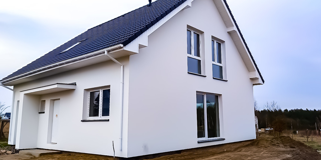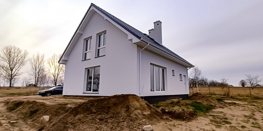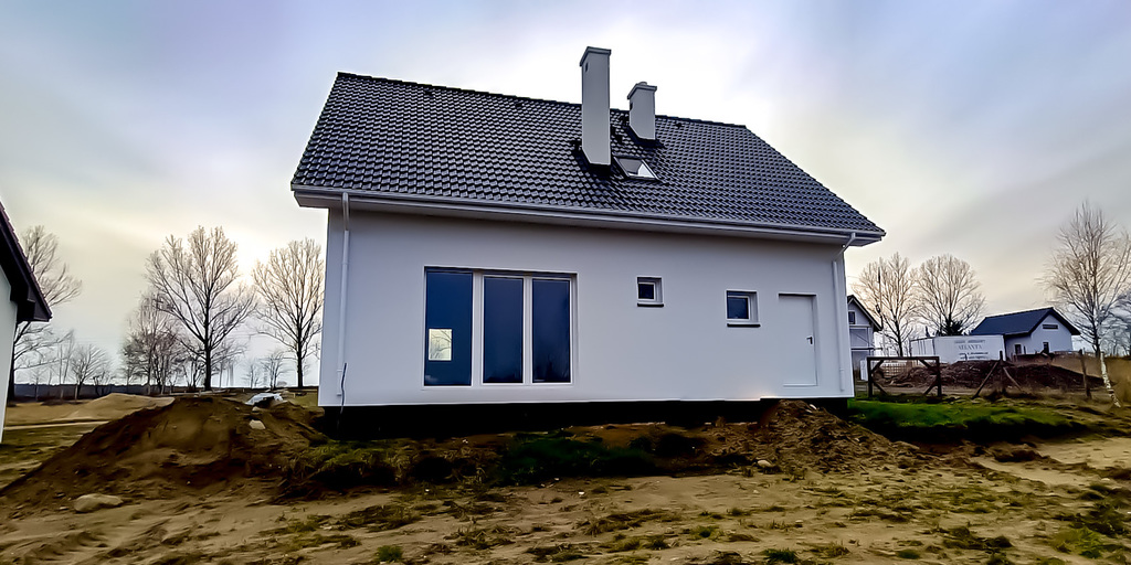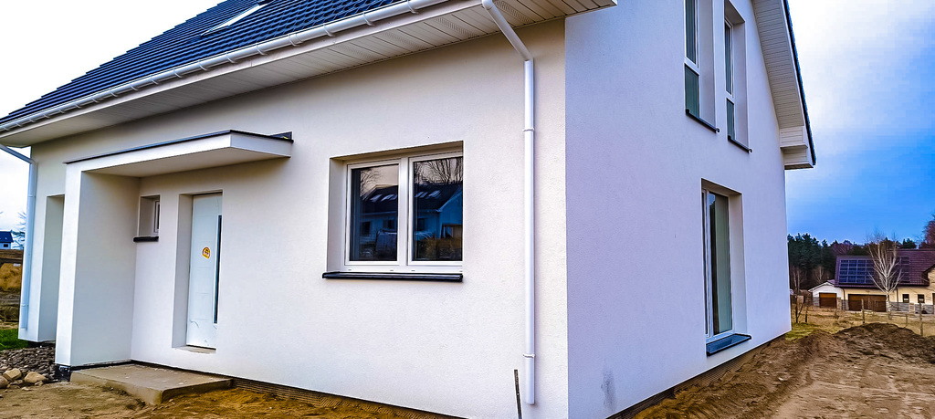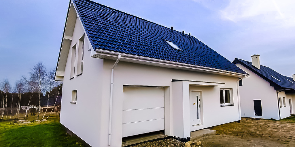 Z wykonaną elewacją zewnętrzną, drzwiami antywłamaniowymi, oknami 3-szybowymi w kolorze białym, bramą garażową.