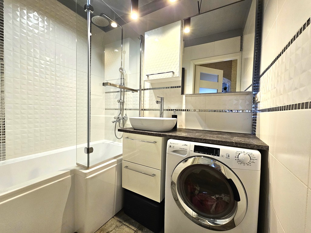 - łazienka (ok. 3,5m2) z wanną asymetryczną co pozwala na wzięcie kąpieli oraz wygodnego prysznica, umywalką oraz pralką,